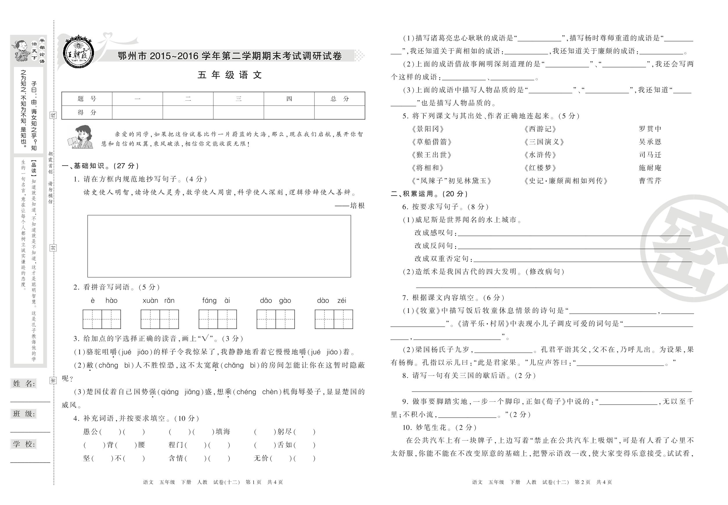 2015-2016学年第二学期鄂州市五年级语文试卷(人教版)【12】