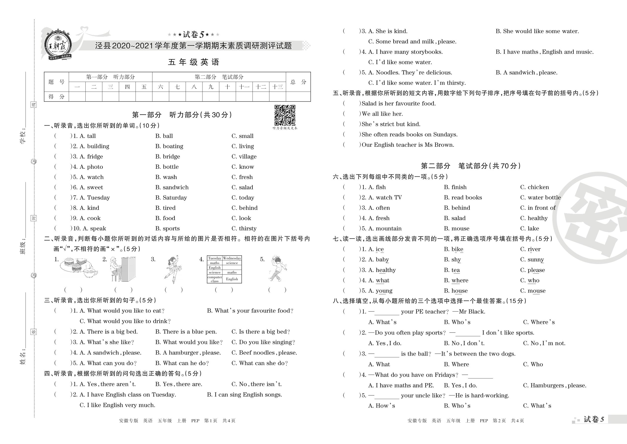 泾县2020~2021学年度第一学期期末素质调研测评试题五年级英语(人教PEP版)【5】