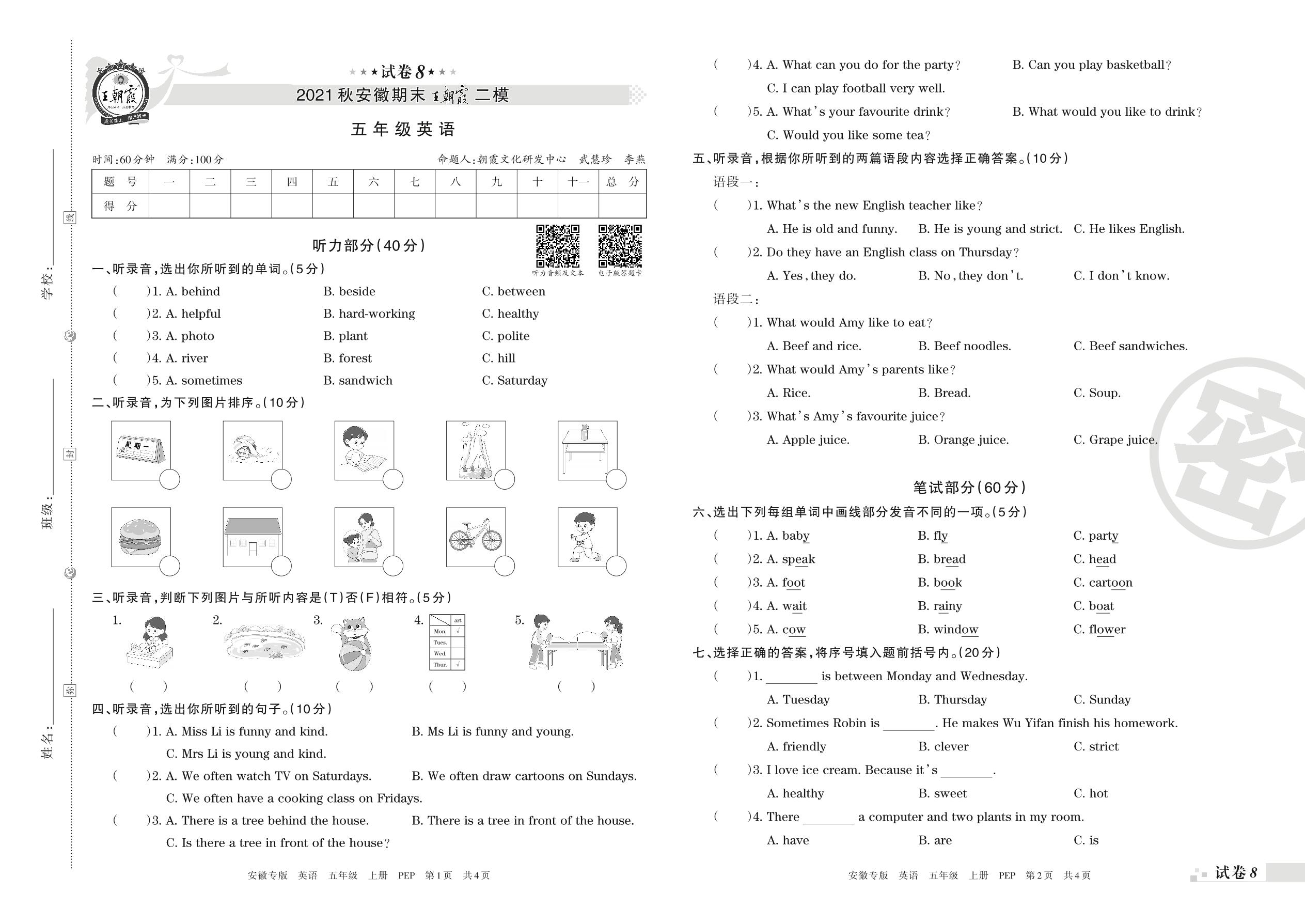王朝霞期末模拟卷五年级上册英语(人教PEP版)【8】