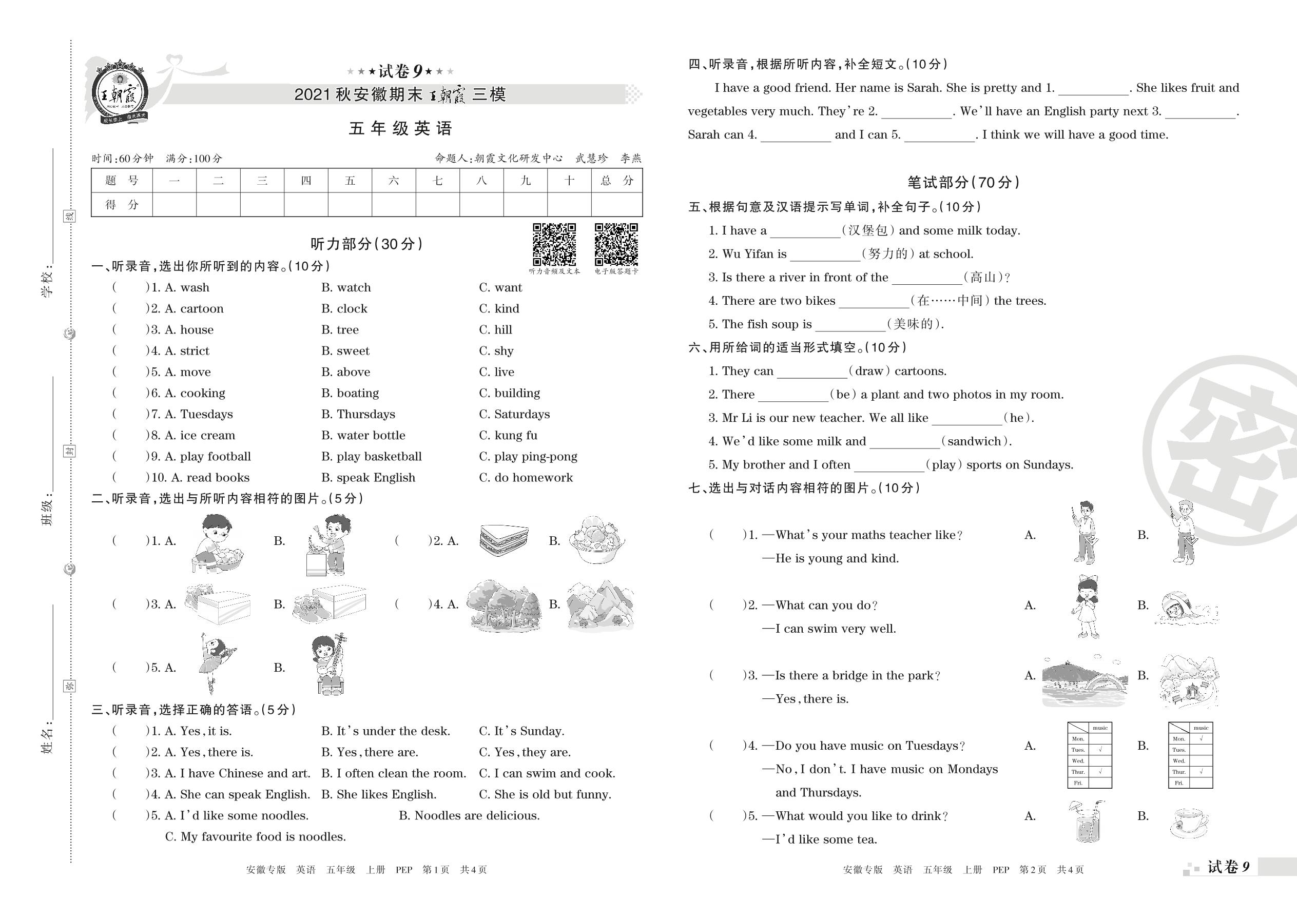 王朝霞期末模拟卷五年级上册英语(人教PEP版)【9】