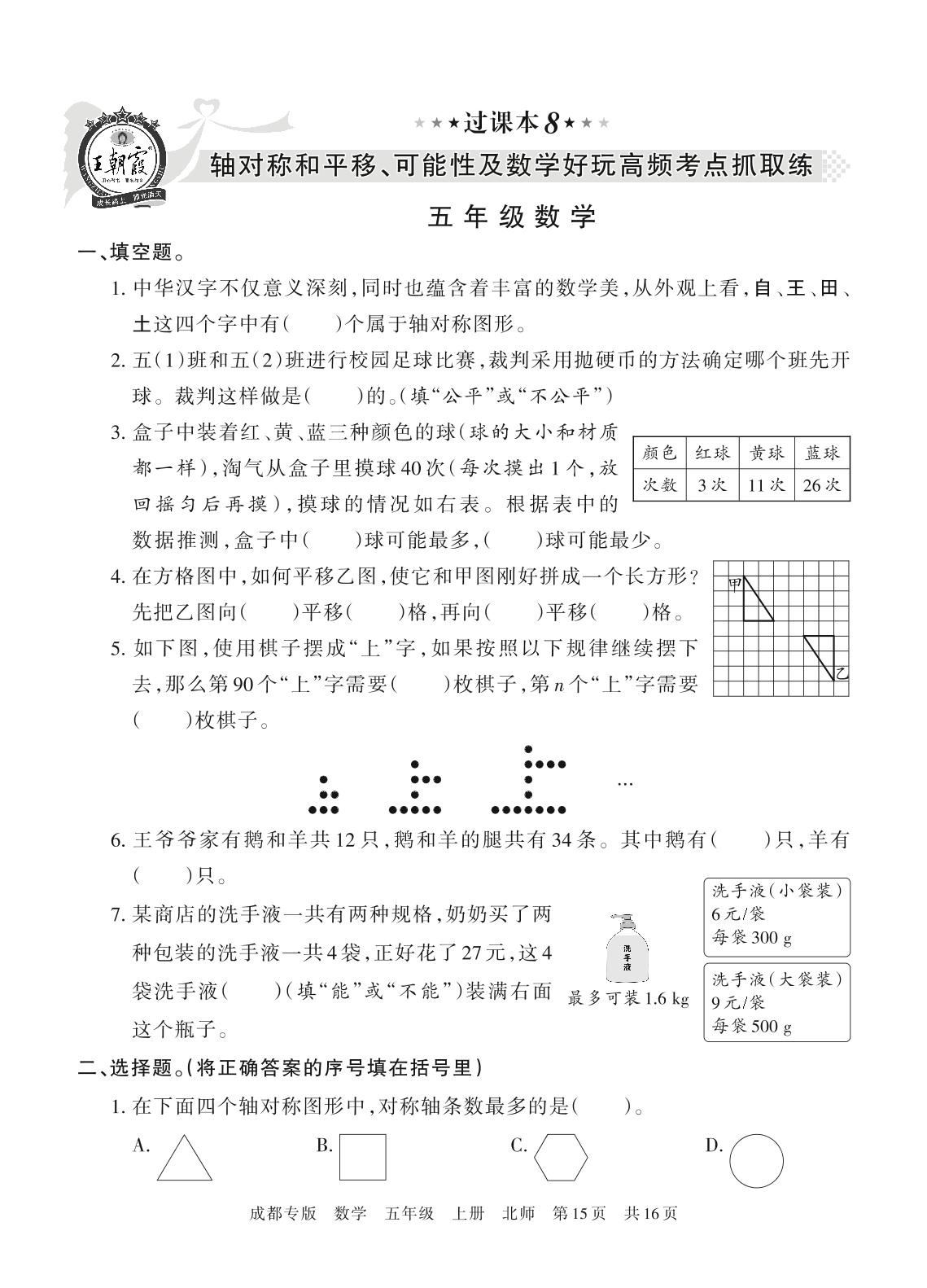 王朝霞期末过课本——轴对称和平移、可能性及数学好玩高频考点抓取练五年级上册数学(北师版)【8】