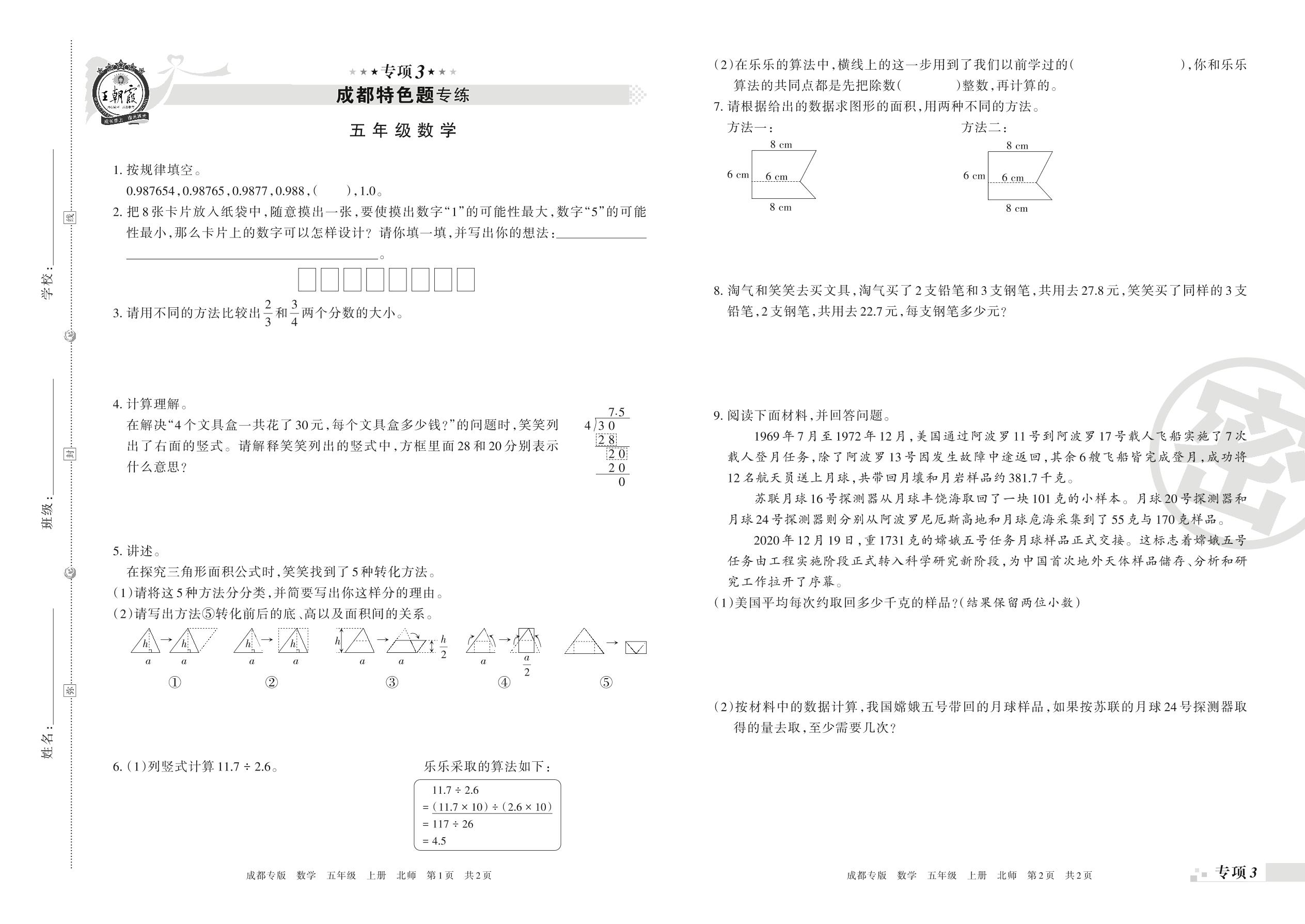 王朝霞期末专项卷——成都特色题专练五年级上册数学(北师版)【3】