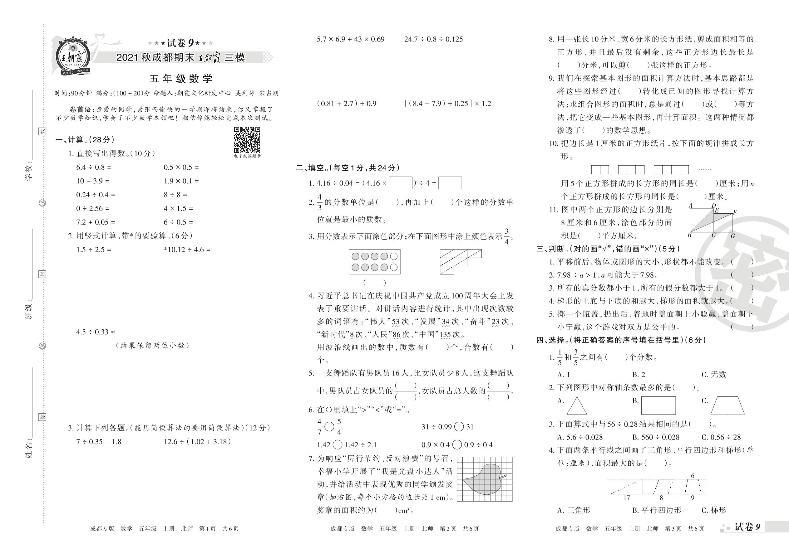 王朝霞期末模拟卷五年级上册数学(北师版)【9】