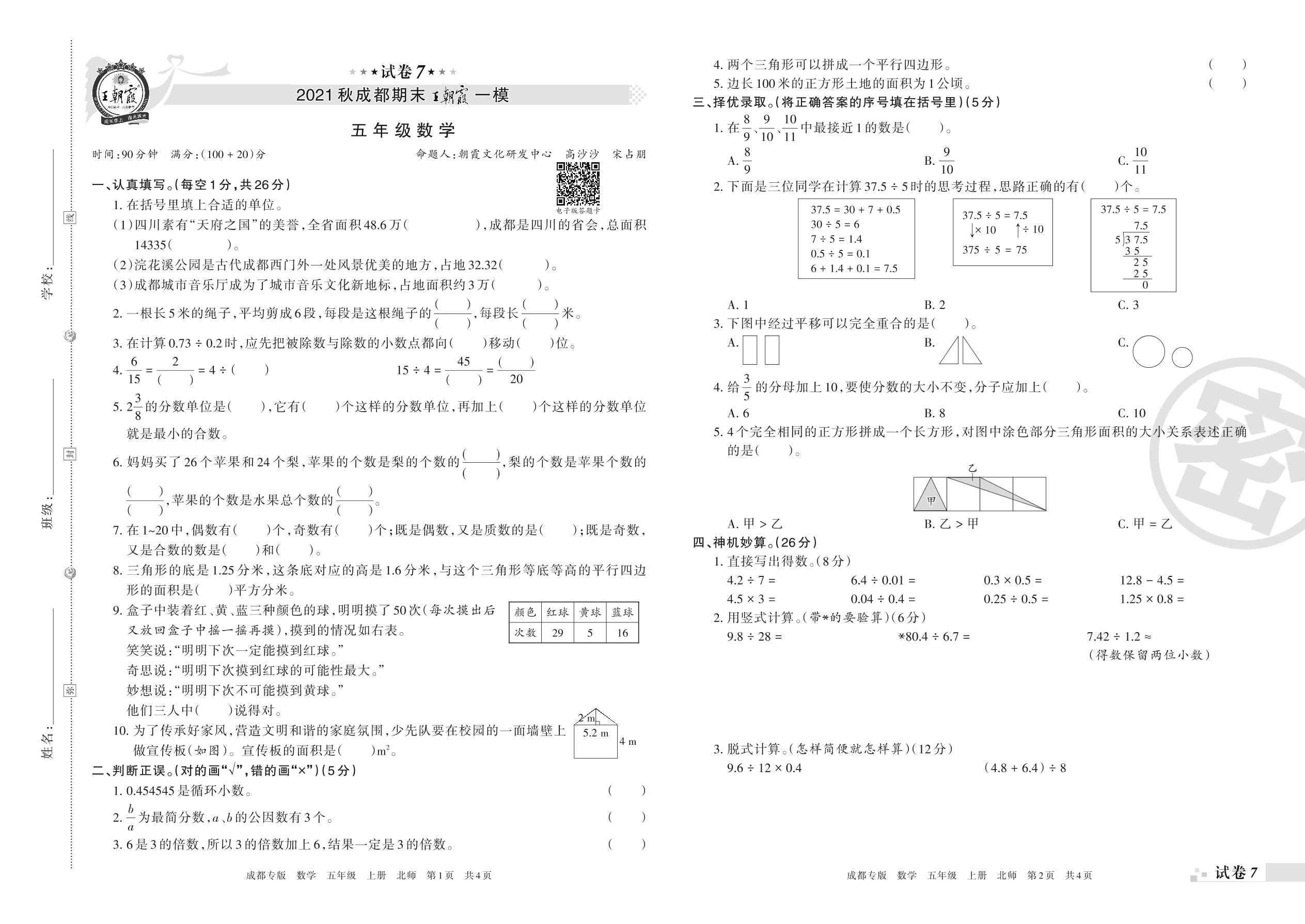 王朝霞期末模拟卷五年级上册数学(北师版)【7】
