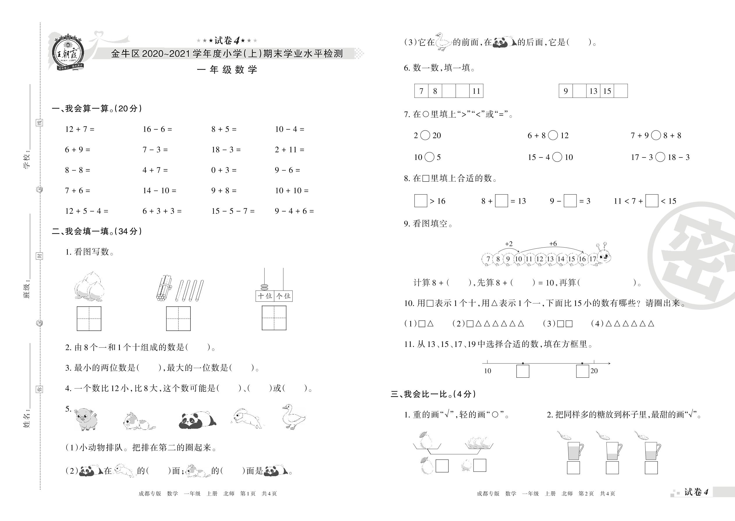 金牛区2020~2021学年度小学(上)期末学业水平检测一年级数学(北师版)【4】