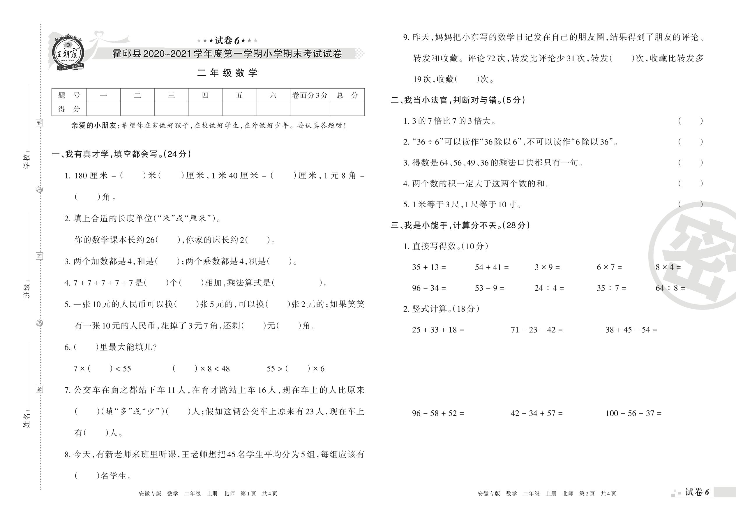 霍邱县2020~2021学年度第一学期小学期末考试试卷二年级数学(北师版)【6】