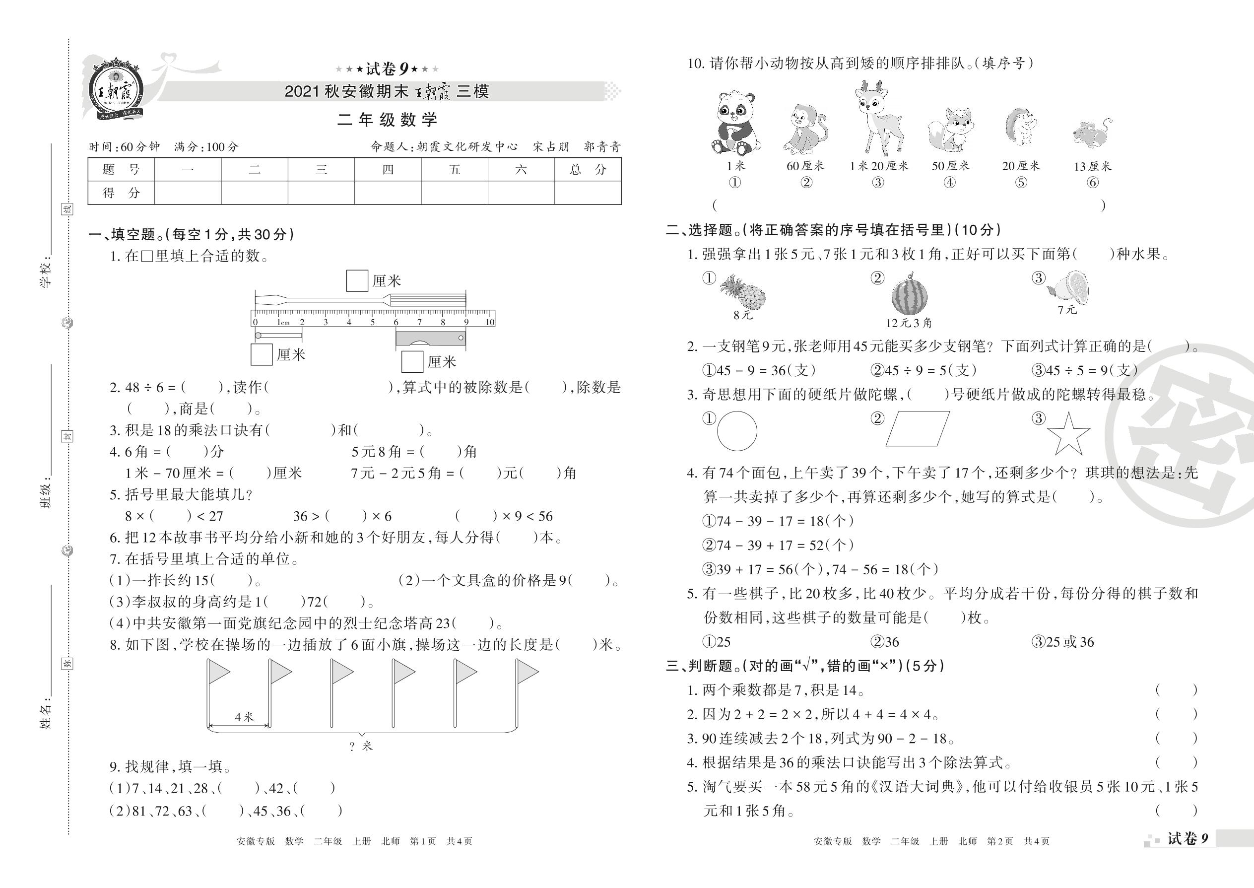 王朝霞期末模拟卷二年级上册数学(北师版)_R211222105935666【9】