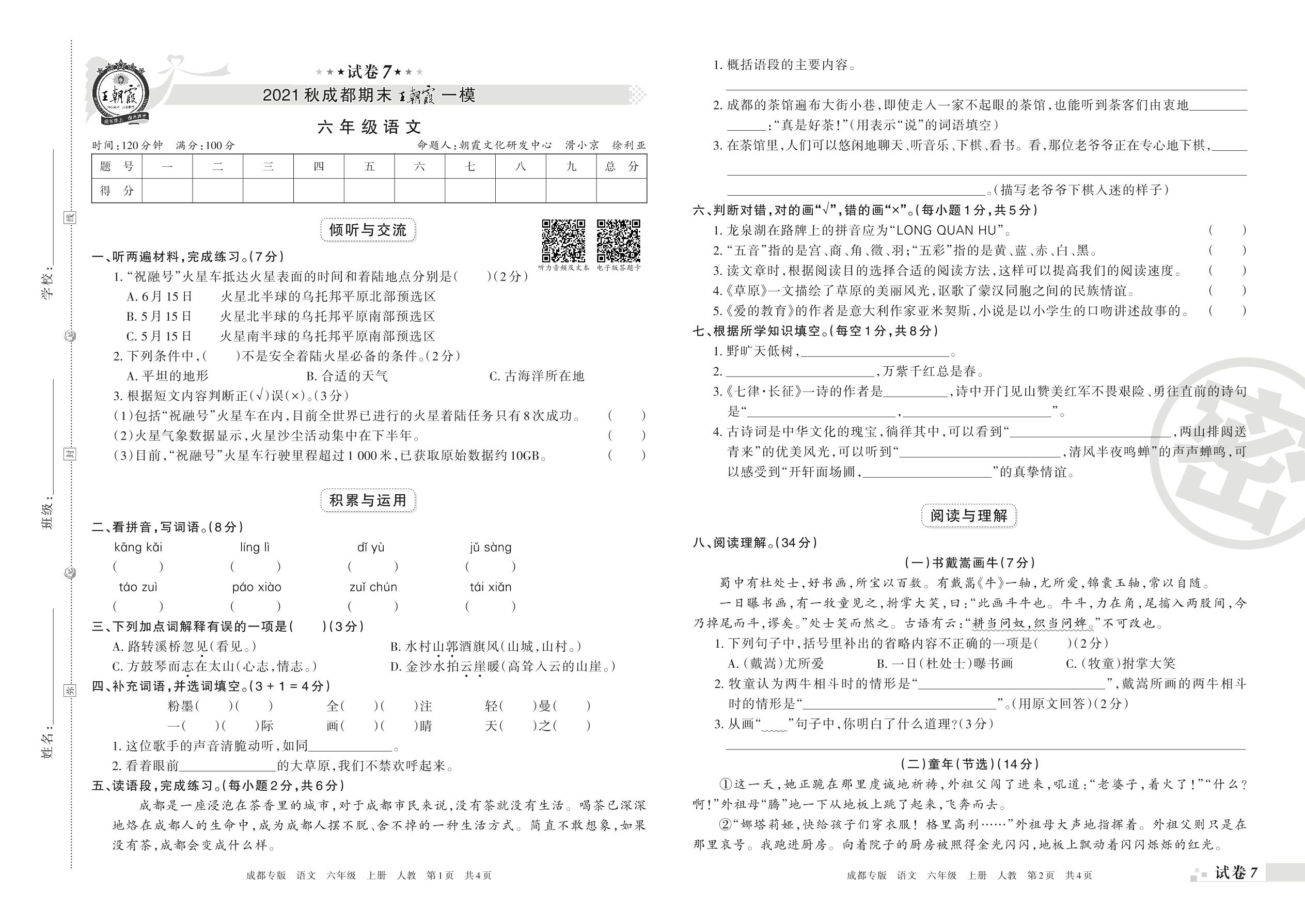 王朝霞期末模拟卷六年级上册语文(人教版)【7】
