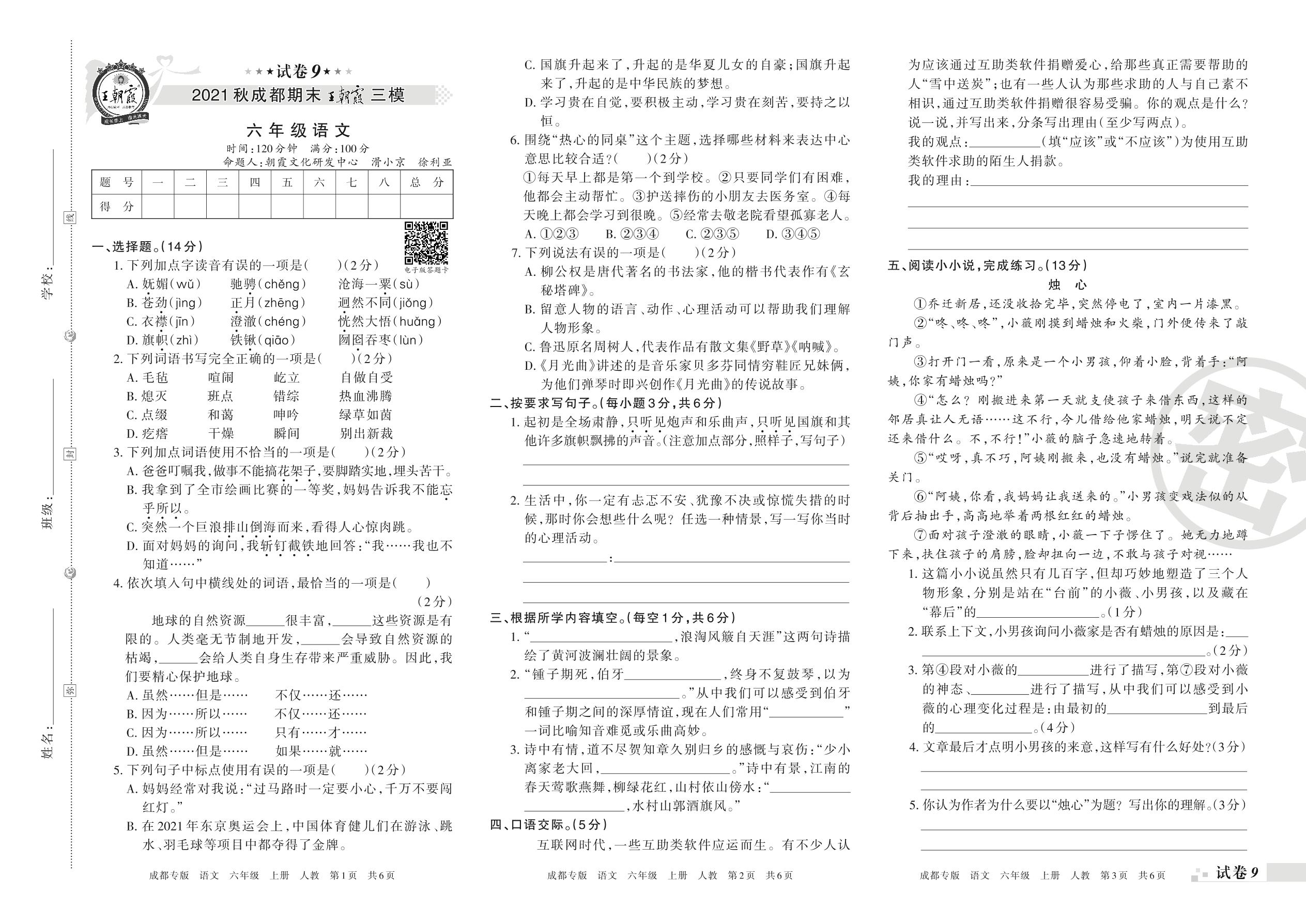 王朝霞期末模拟卷六年级上册语文(人教版)【9】