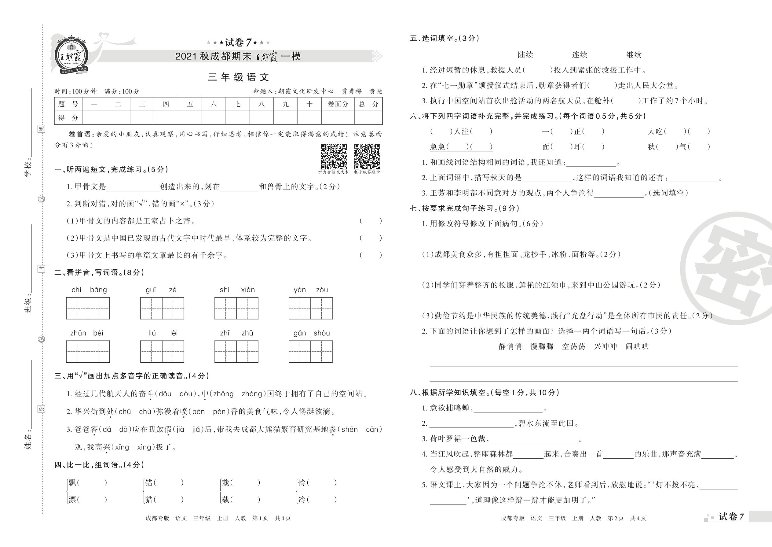 王朝霞期末模拟卷三年级上册语文(人教版)【7】