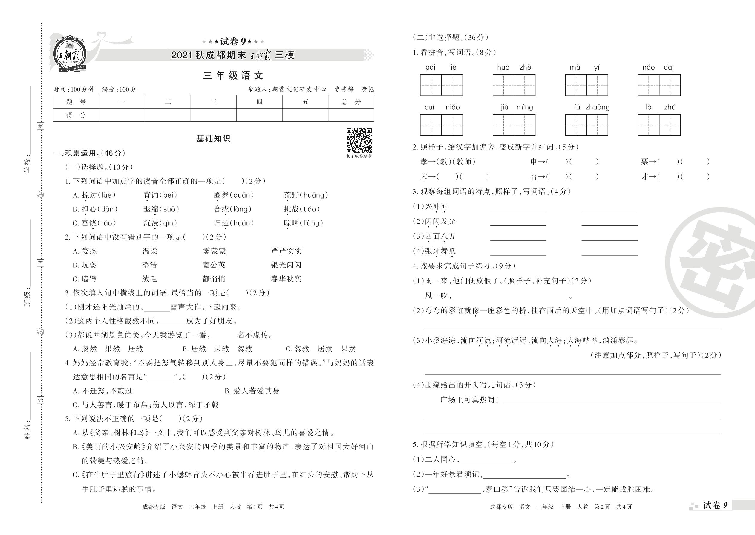 王朝霞期末模拟卷三年级上册语文(人教版)_R211222110449071【9】