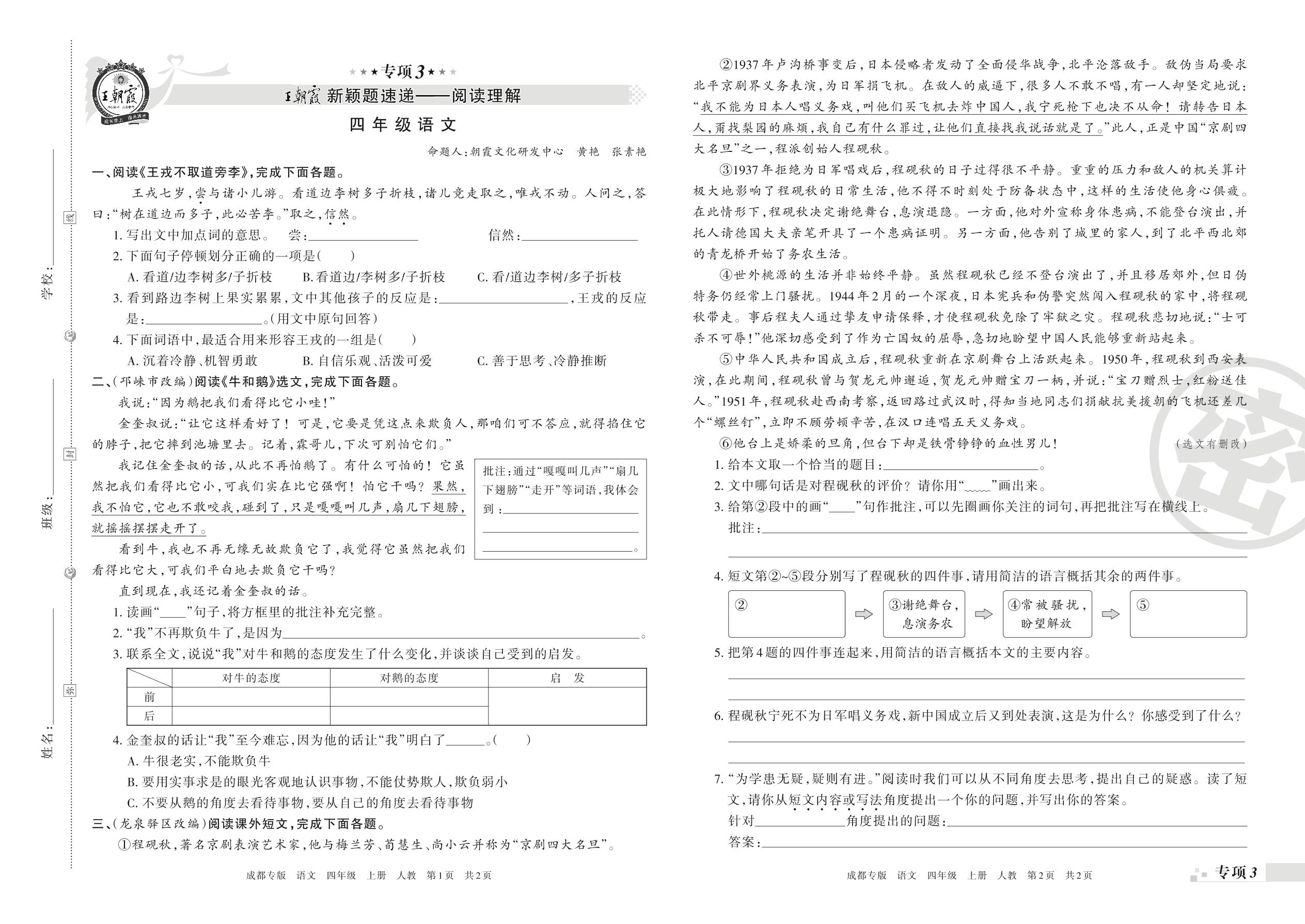 王朝霞期末专项卷——新颖题速递:阅读理解四年级上册语文(人教版)【3】