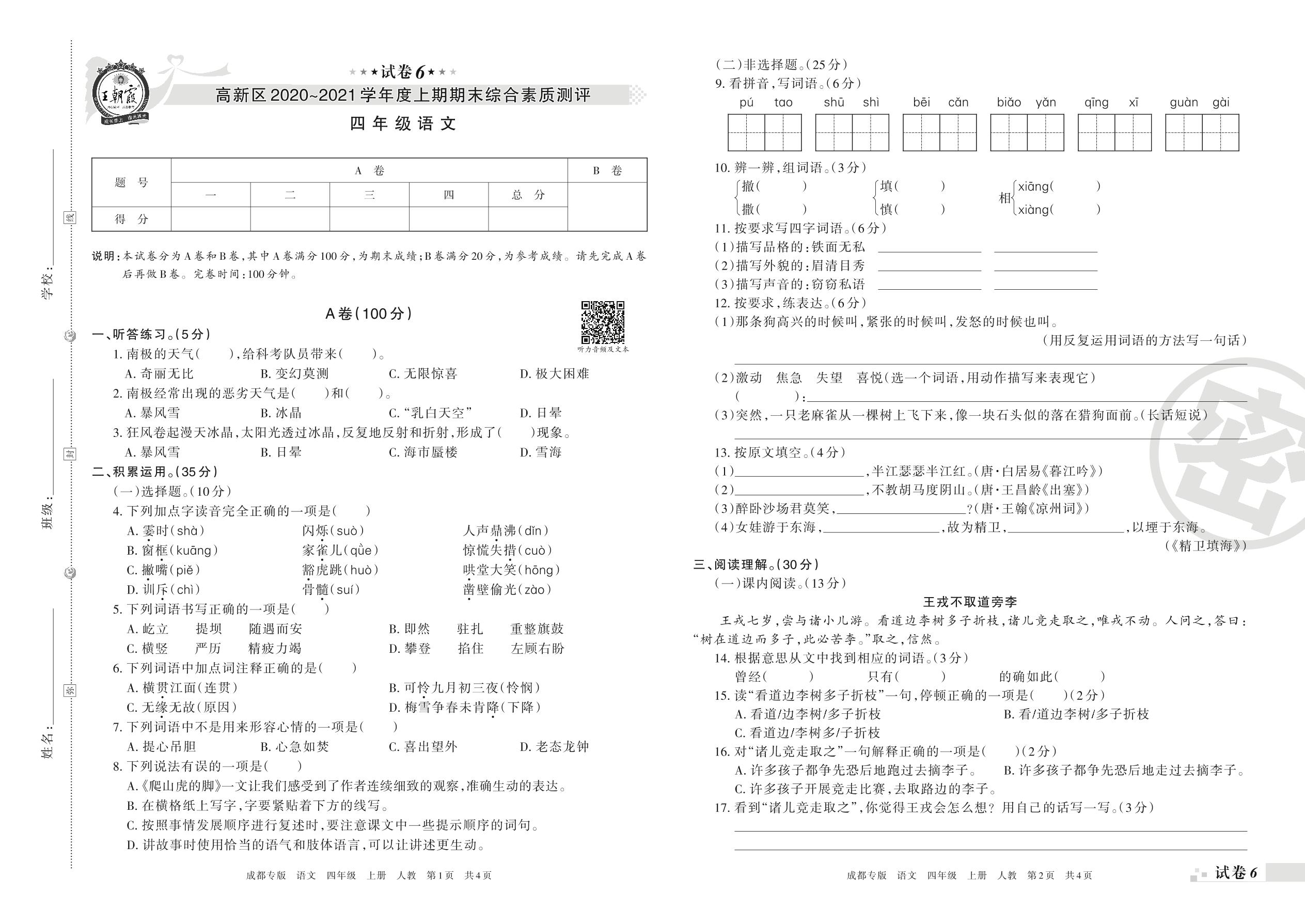 高新区2020~2021学年度上期期末综合素质测评四年级语文(人教版)【6】