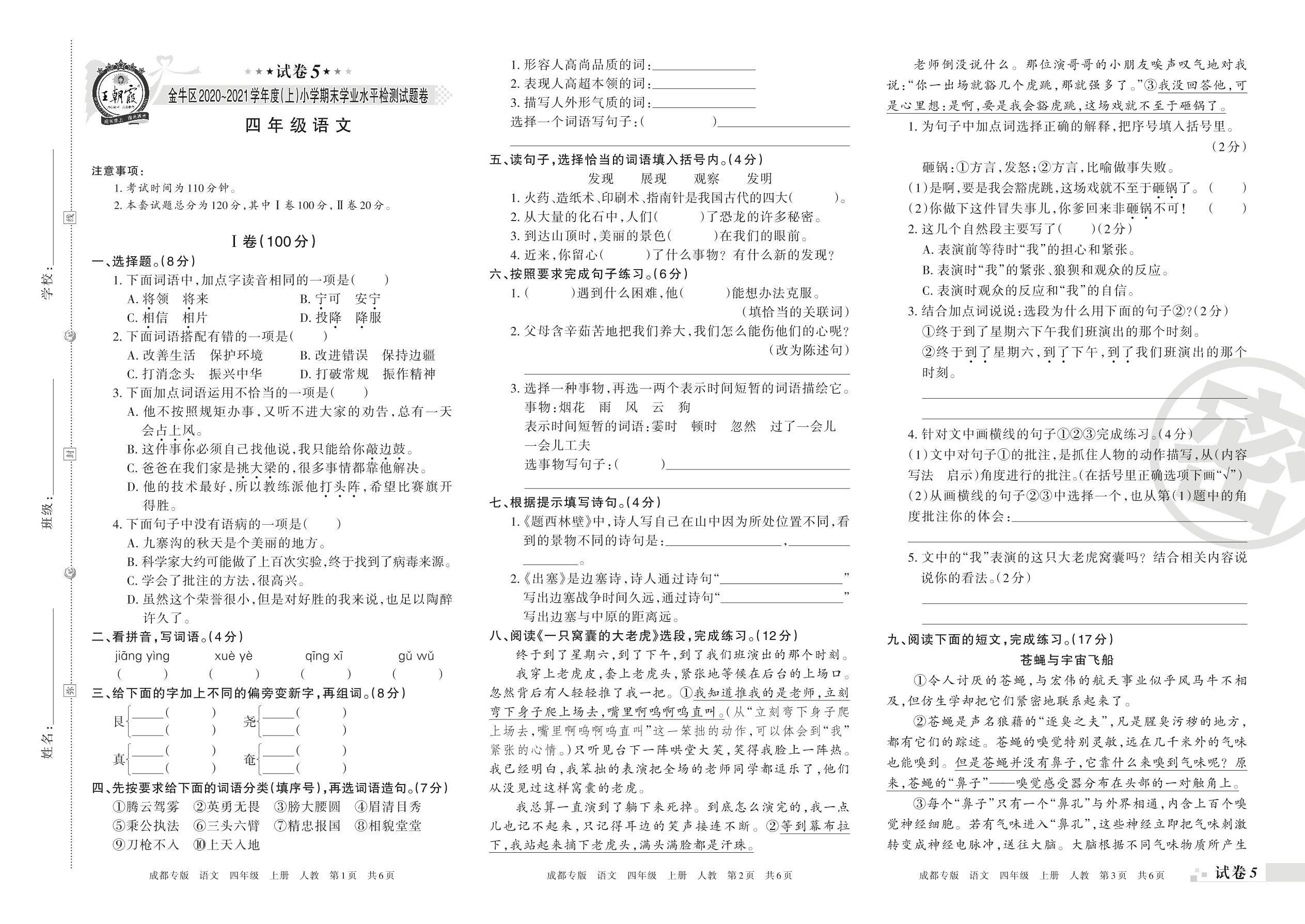 金牛区2020~2021学年度(上)小学期末学业水平检测试题卷四年级语文(人教版)【5】