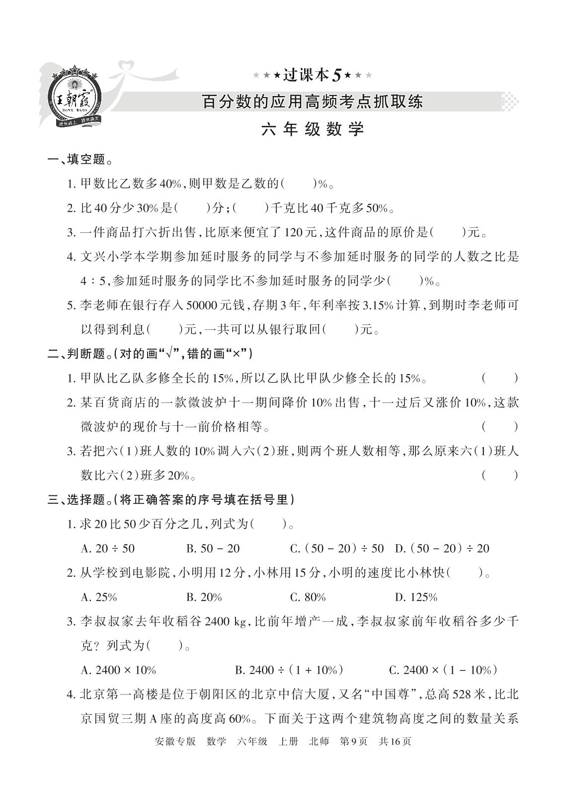王朝霞期末过课本——百分数的应用高频考点抓取练六年级上册数学(北师版)_R211222111240703【5】