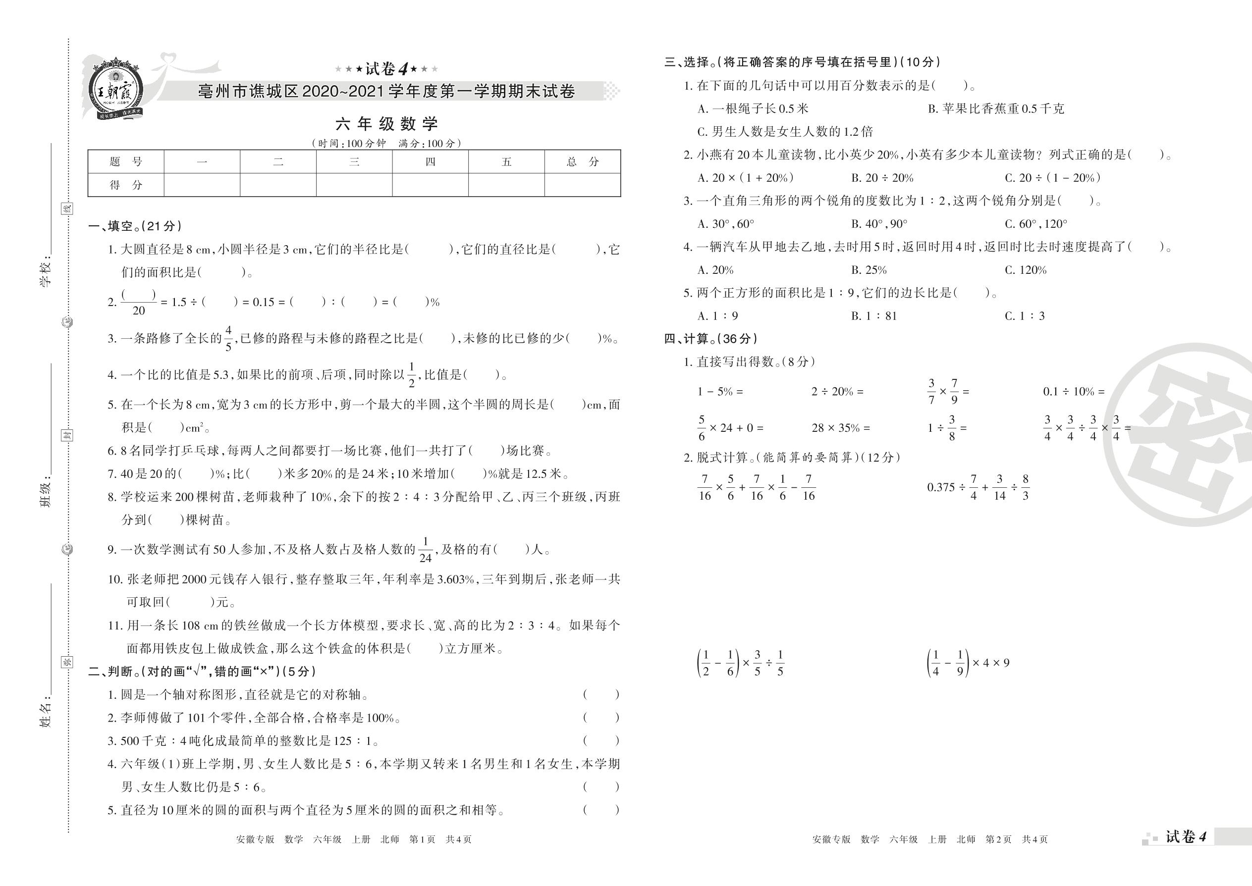 亳州市谯城区2020~2021学年度第一学期期末试卷六年级数学(北师版)【4】