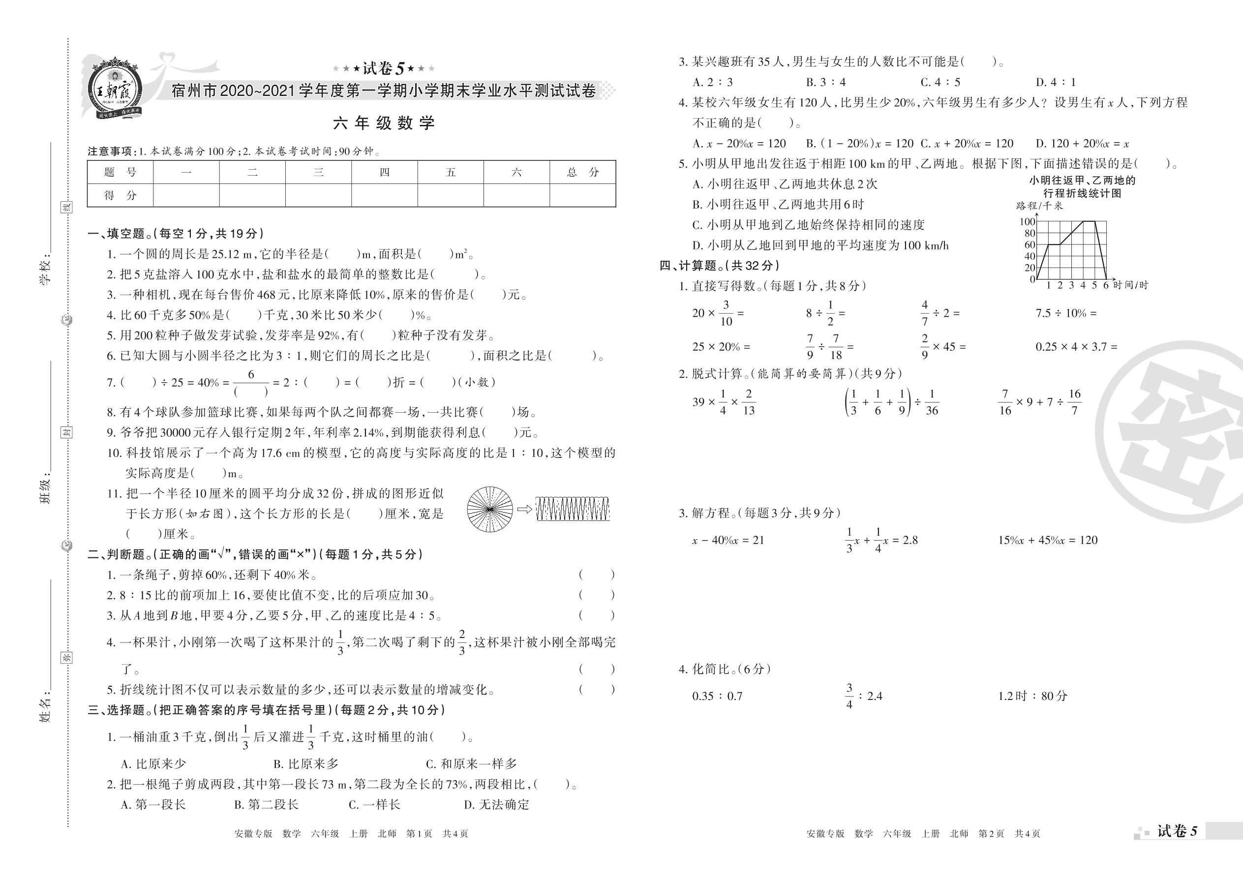 宿州市2020~2021学年度第一学期小学期末学业水平测试试卷六年级数学(北师版)【5】