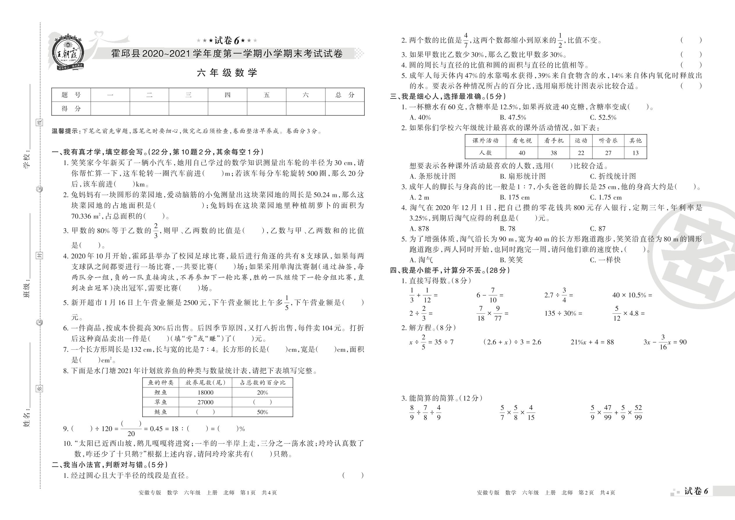 霍邱县2020~2021学年度第一学期小学期末考试试卷六年级数学(北师版)【6】