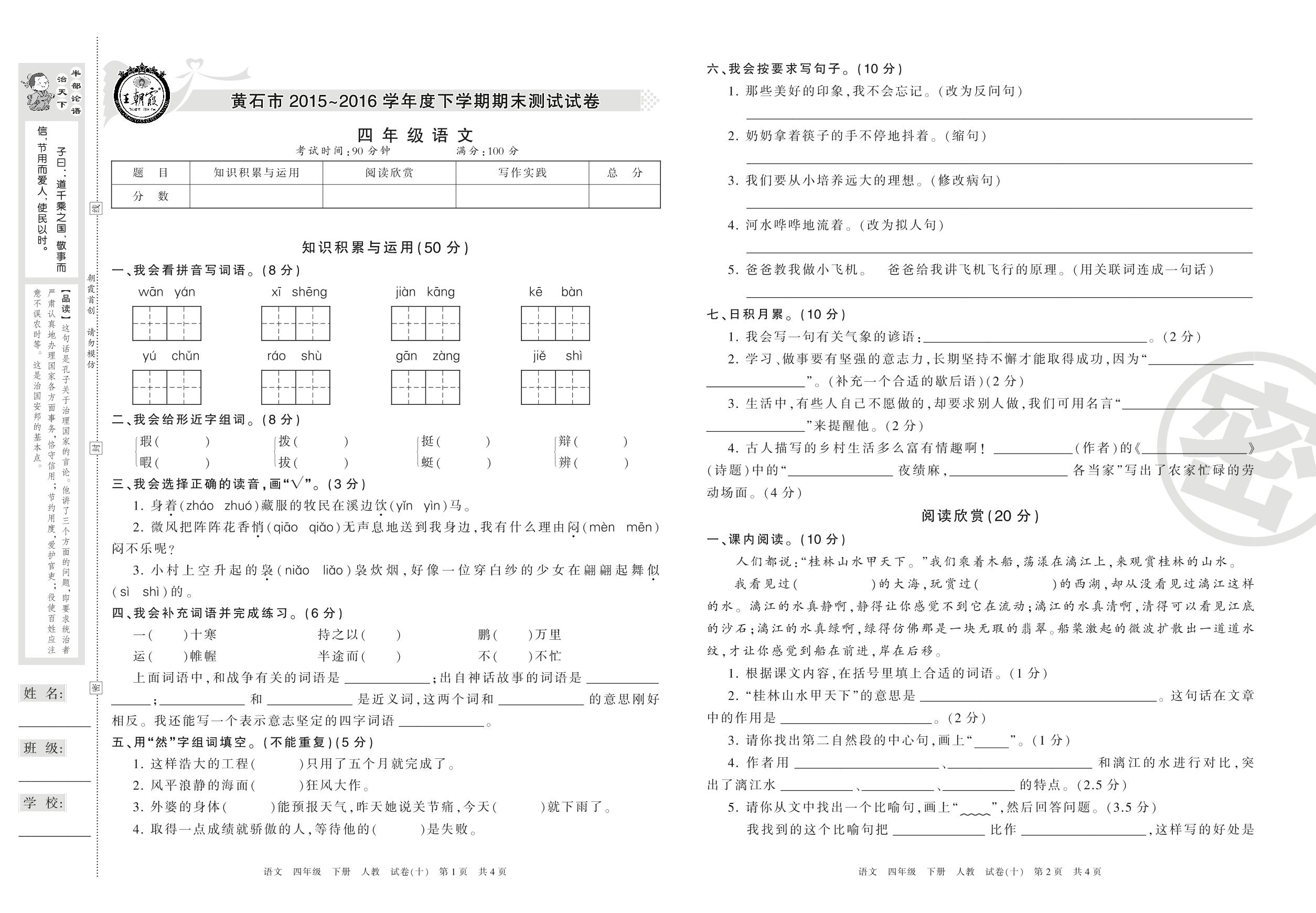 2015-2016学年第二学期黄石市四年级语文试卷(人教版)【10】