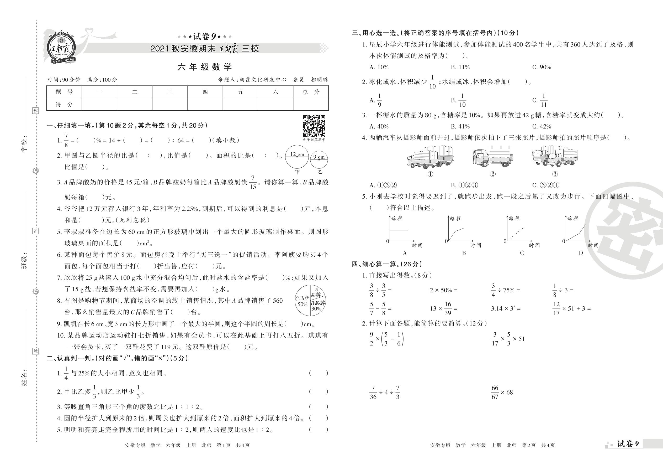 王朝霞期末模拟卷六年级上册数学(北师版)_R211222111241329【9】