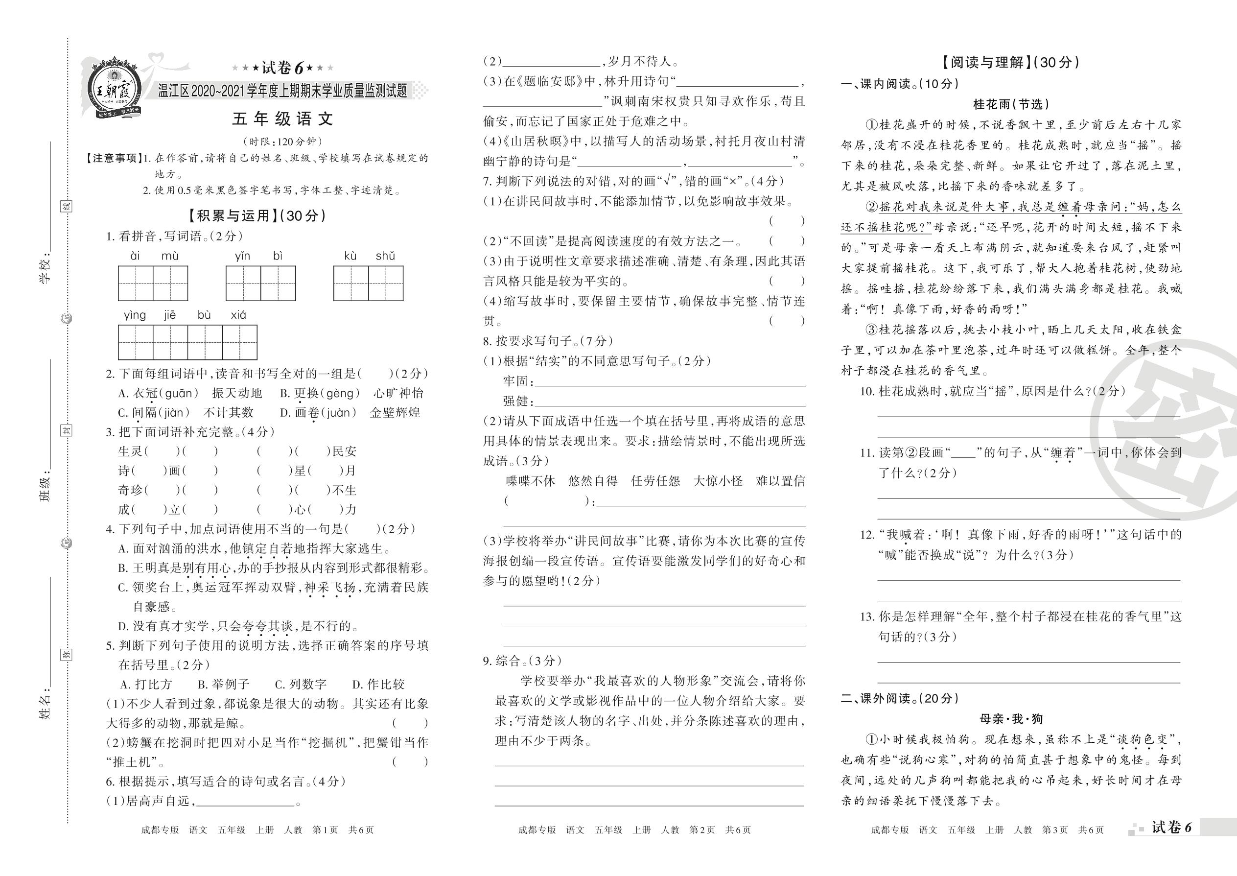 温江区2020~2021学年度上期期末学业质量监测试题五年级语文(人教版)【6】