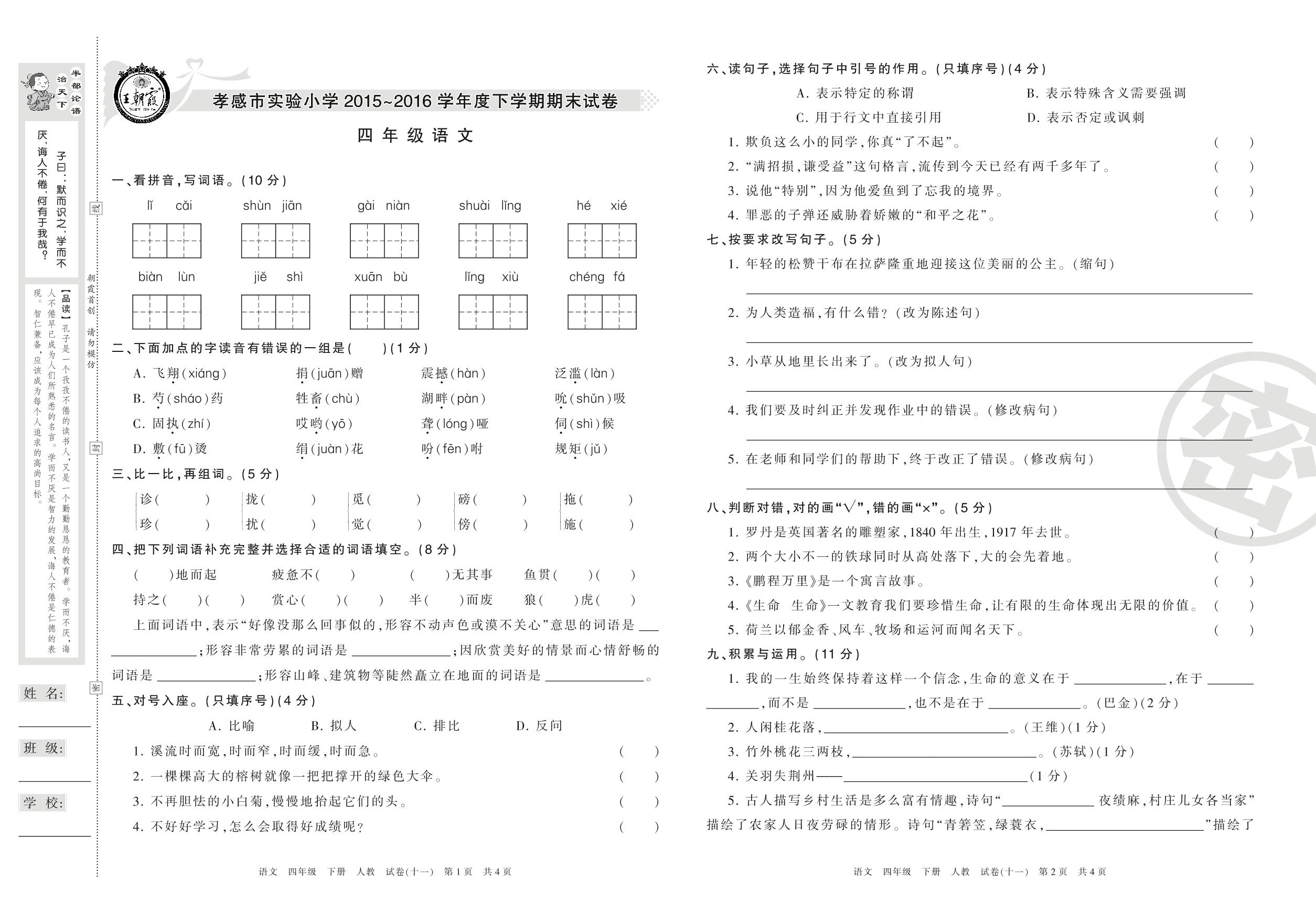 2015-2016学年第二学期孝感市四年级语文试卷(人教版)【11】