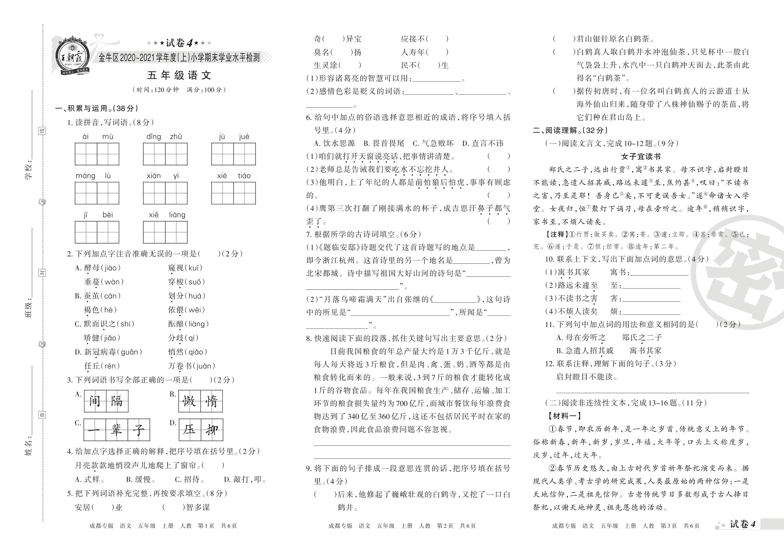 金牛区2020~2021学年度(上)小学期末学业水平检测五年级语文(人教版)【4】