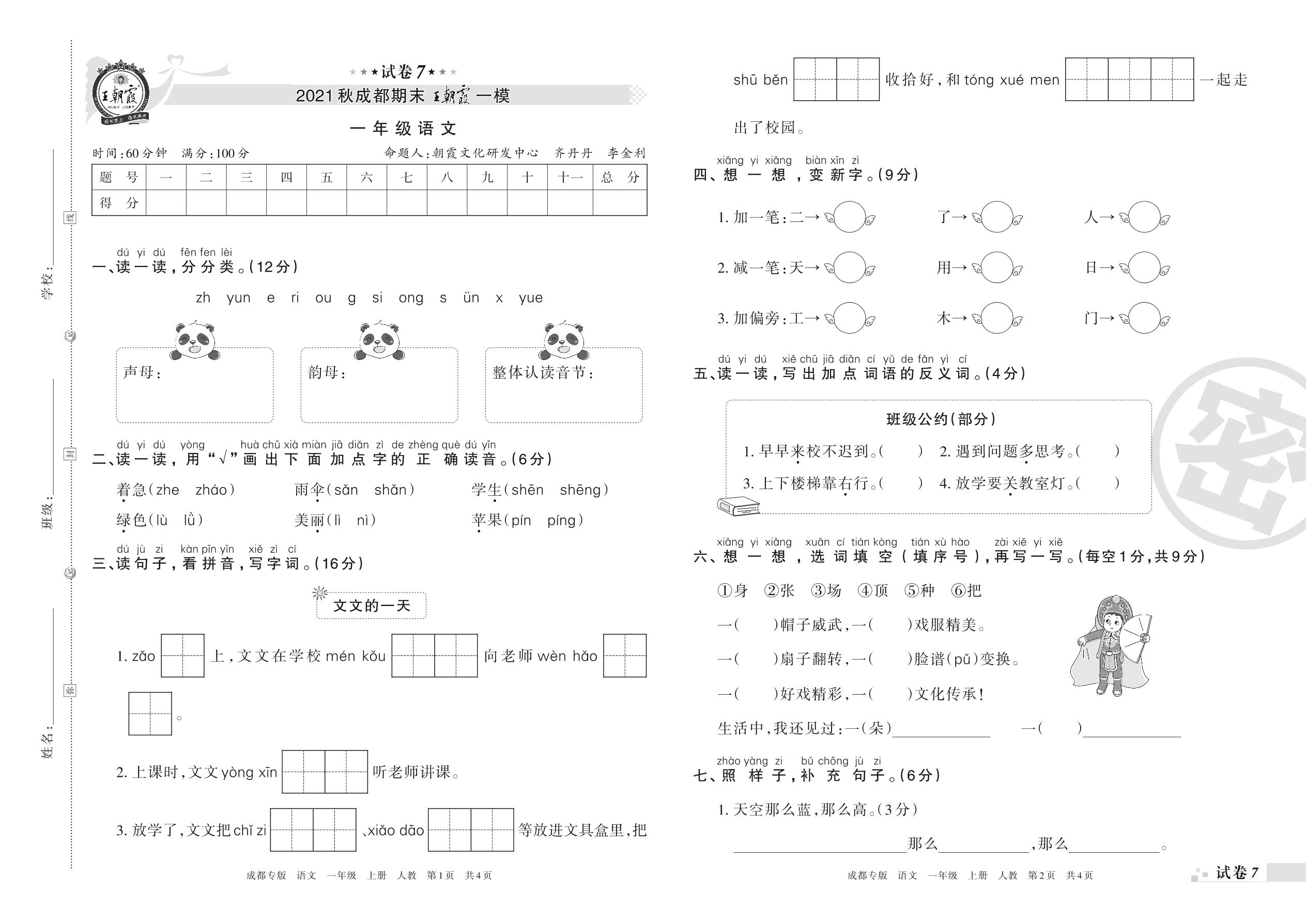 王朝霞期末模拟卷一年级上册语文(人教版)【7】