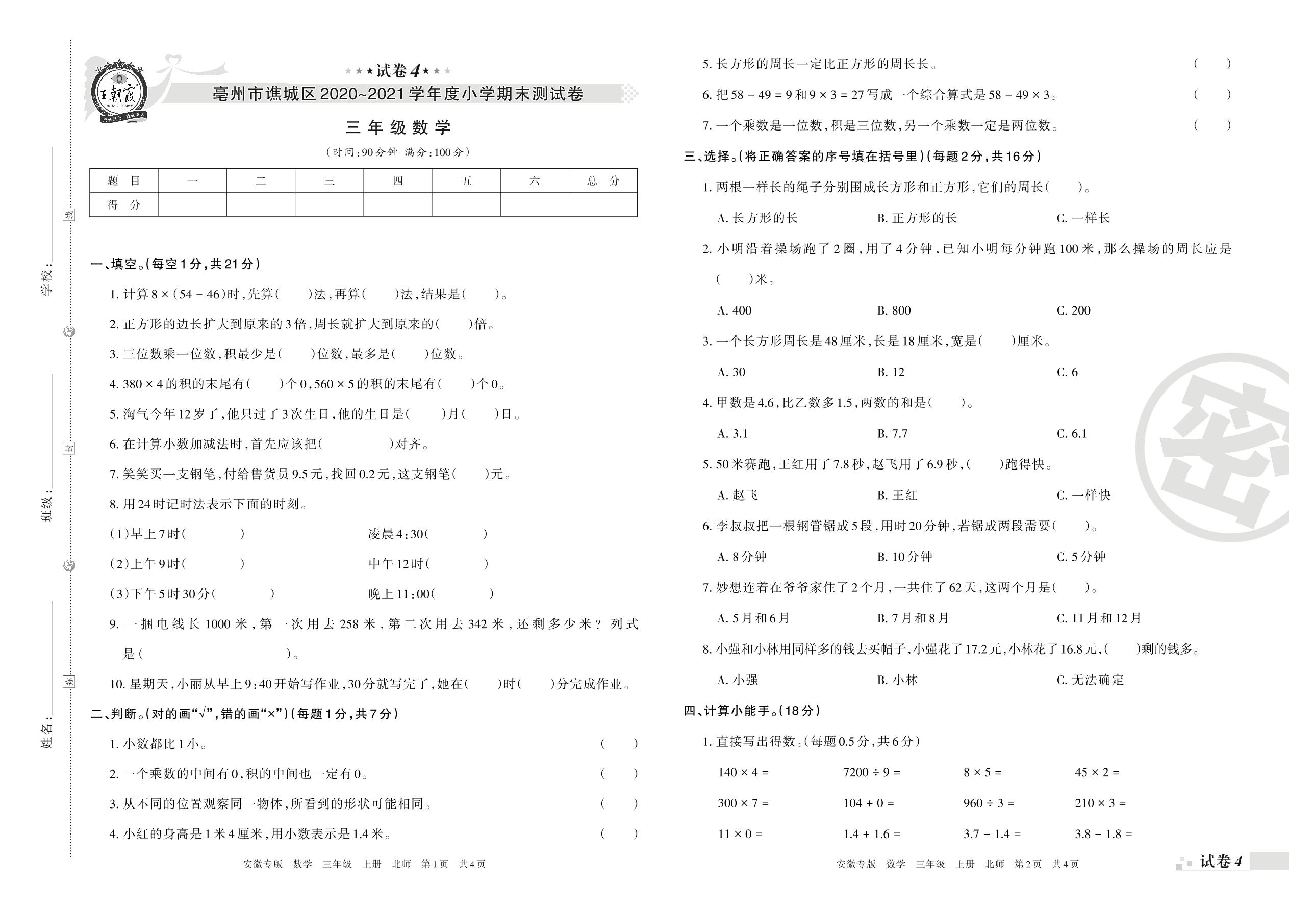 亳州市谯城区2020~2021学年度小学期末测试卷三年级数学(北师版)【4】