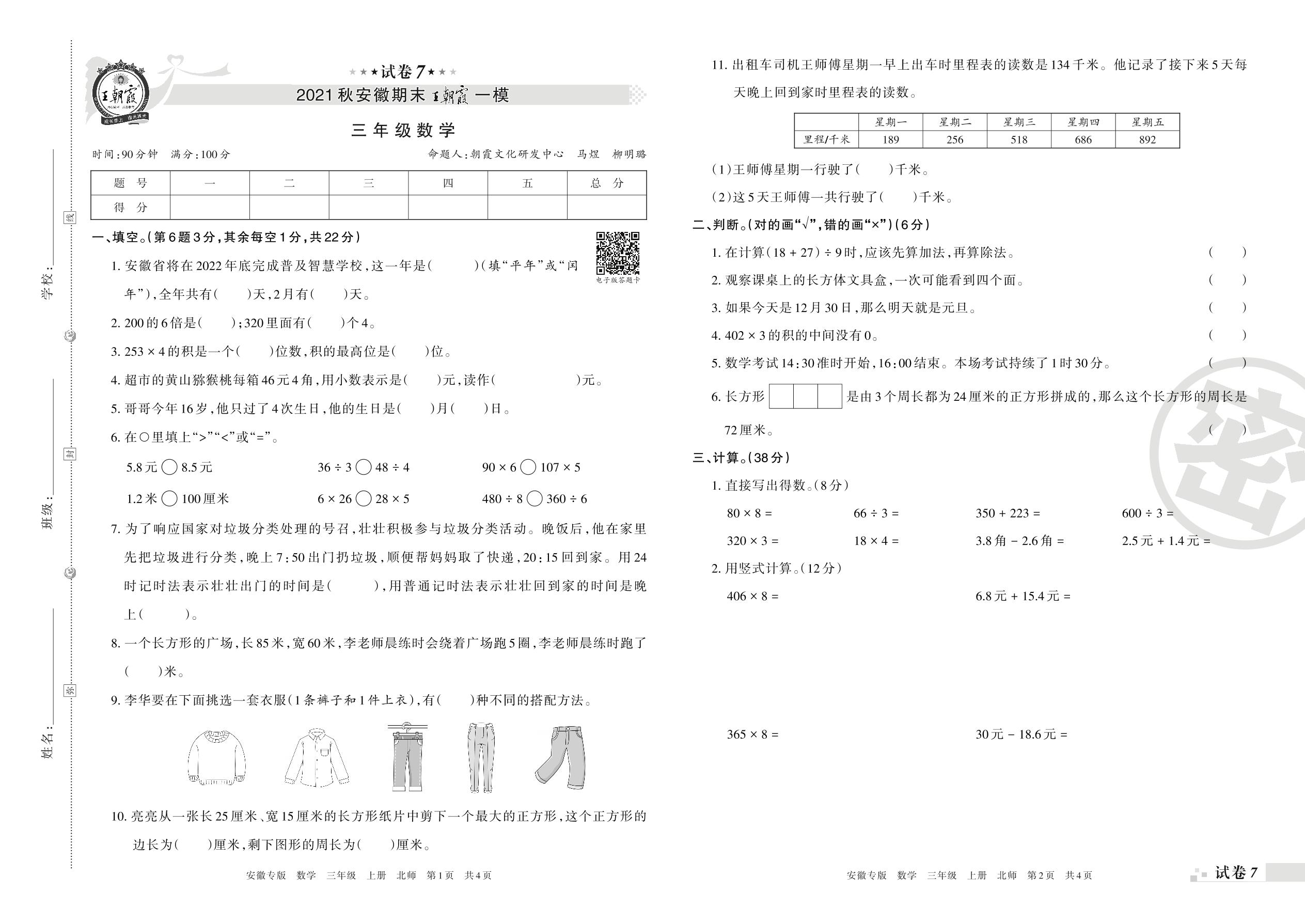 王朝霞期末模拟卷三年级上册数学(北师版)_R211222112219523【7】