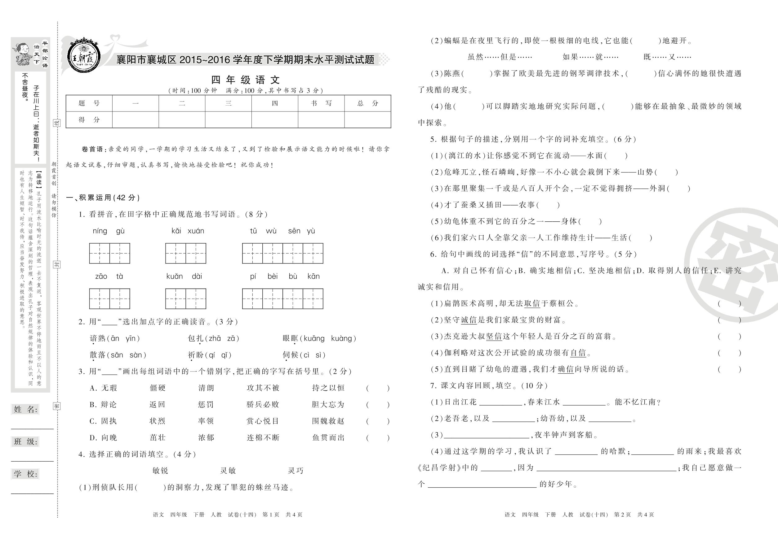 2015-2016学年第二学期襄阳市襄城区四年级语文试卷(人教版)【14】