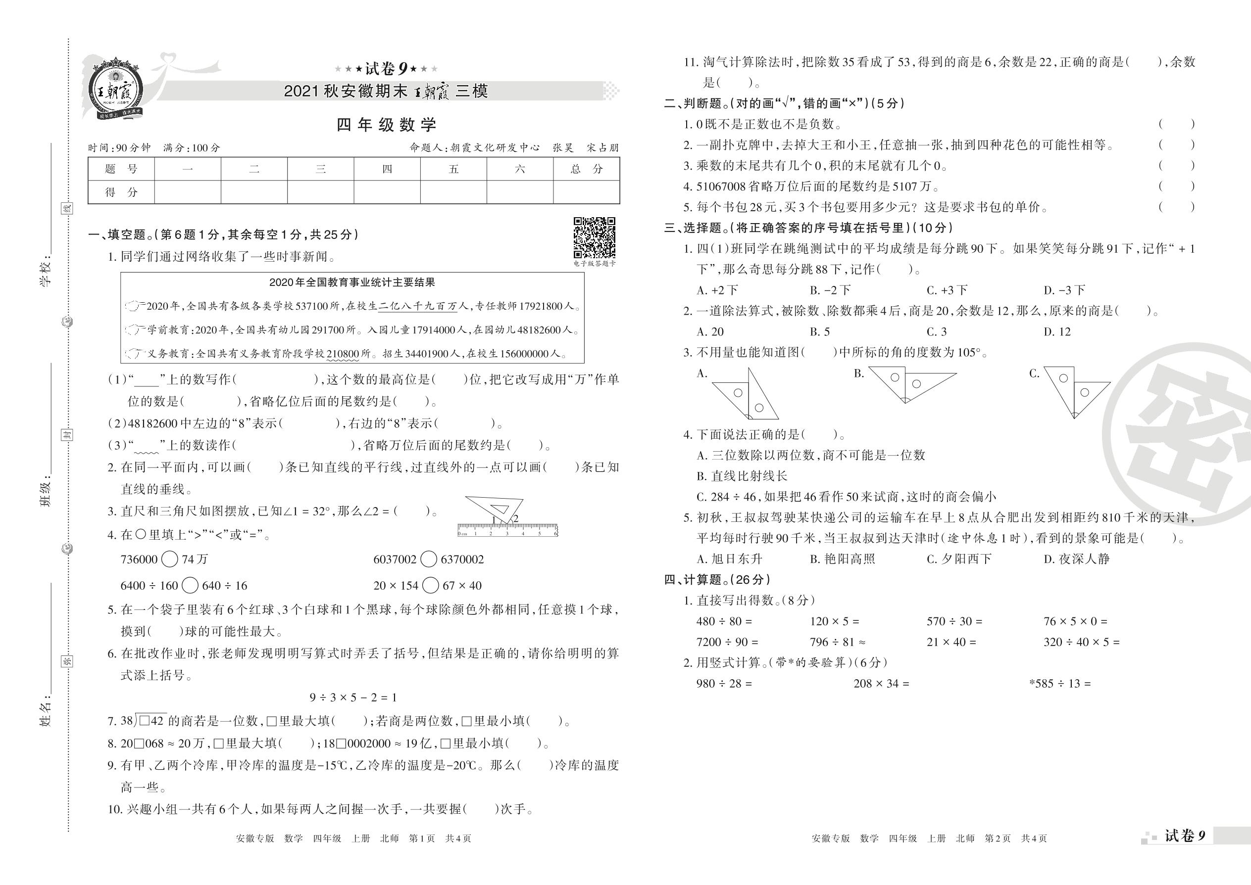 王朝霞期末模拟卷四年级上册数学(北师版)_R211222120238346【9】