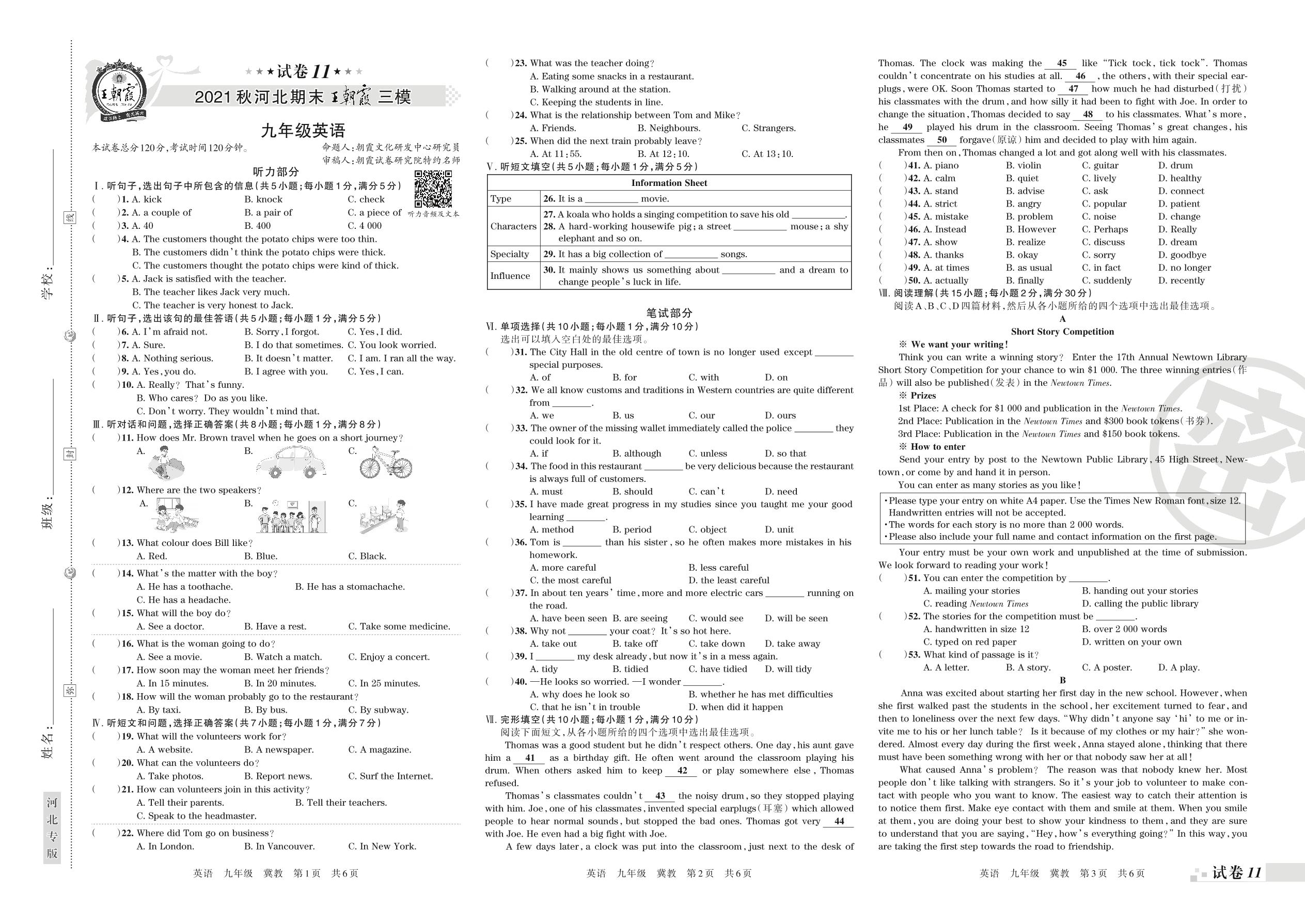 2021-2022学年第一学期王朝霞期末模拟卷九年级英语(冀教版)【11】