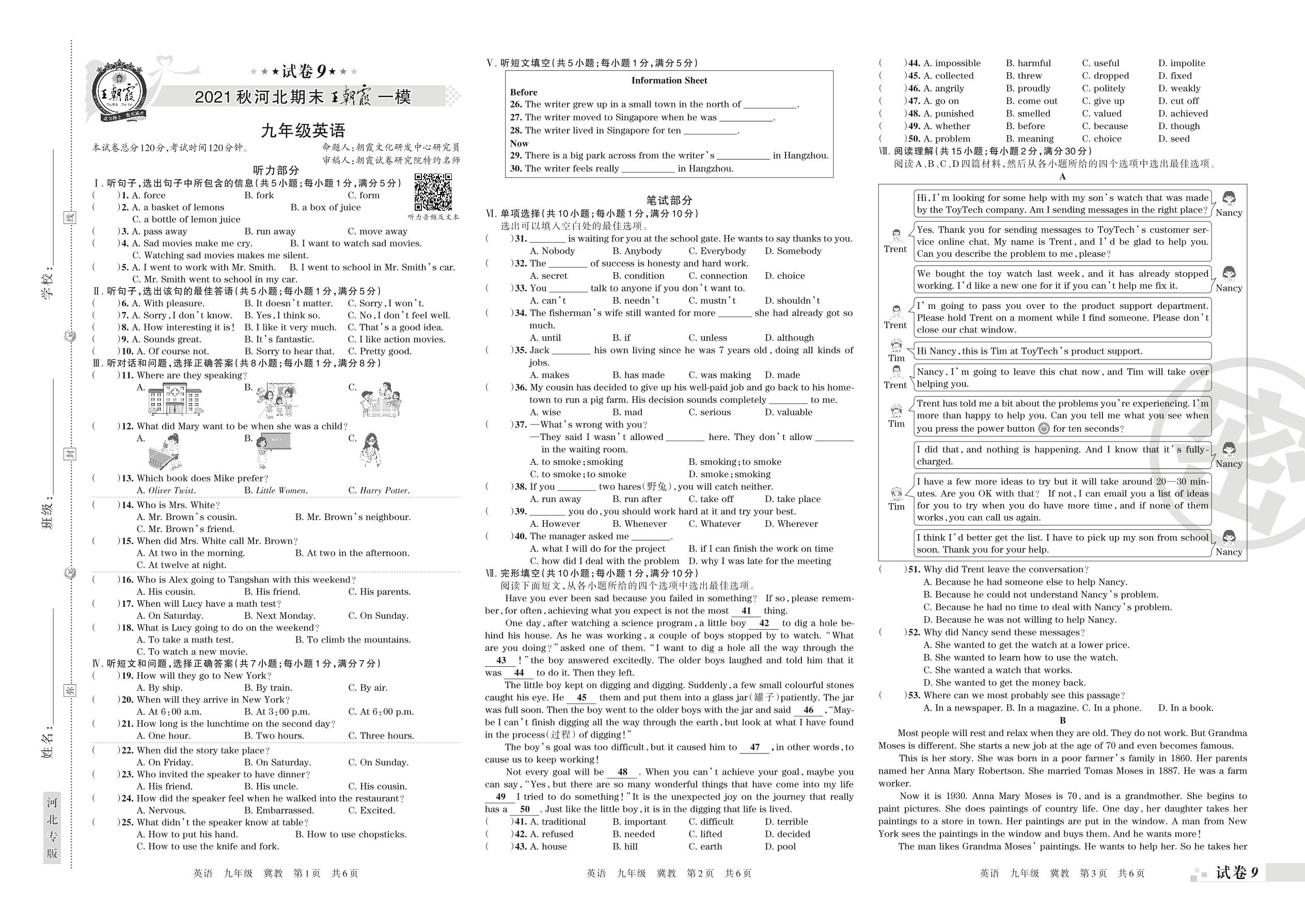 2021-2022学年第一学期王朝霞期末模拟卷九年级英语(冀教版)【9】