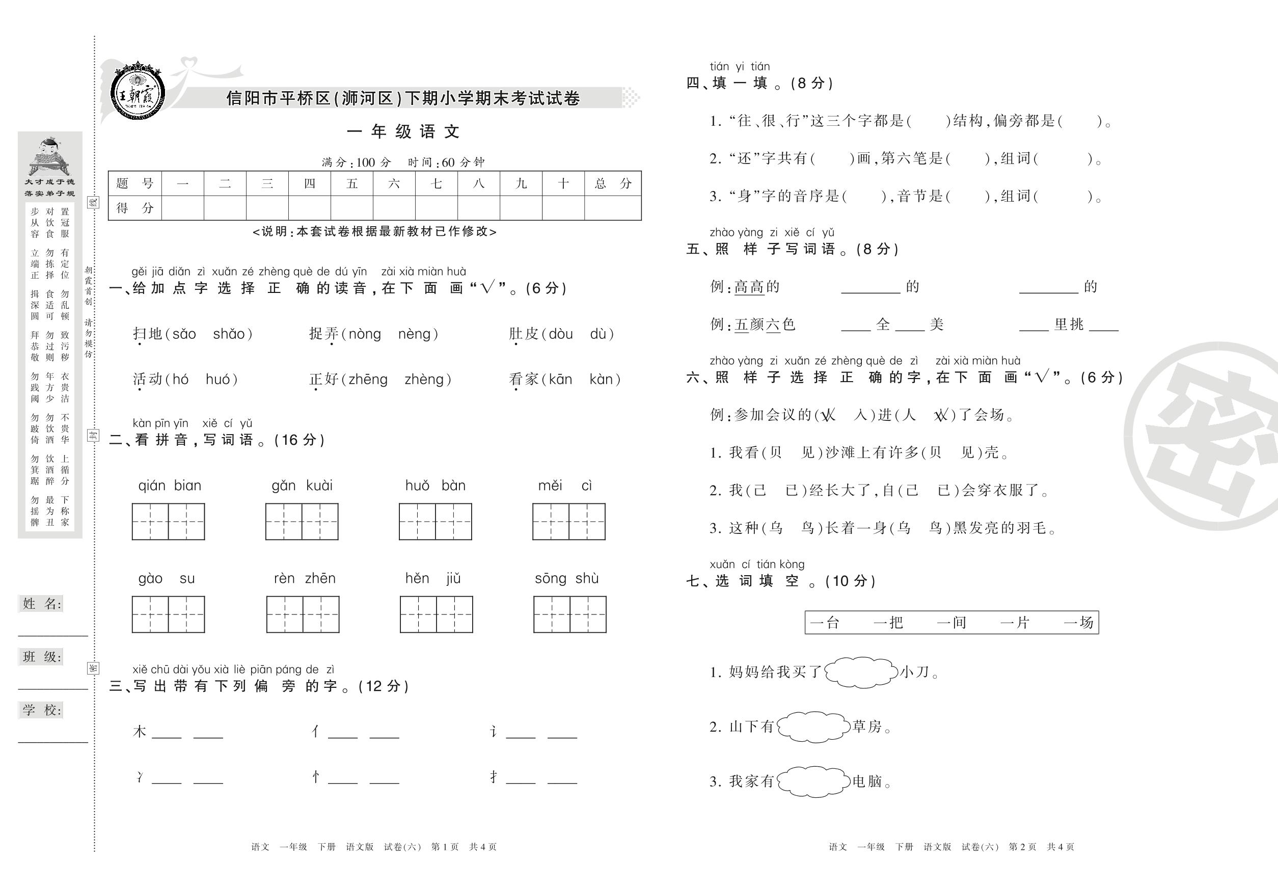2015-2016学年第二学期信阳市平桥区(浉河区)一年级语文试卷(语文版)【6】