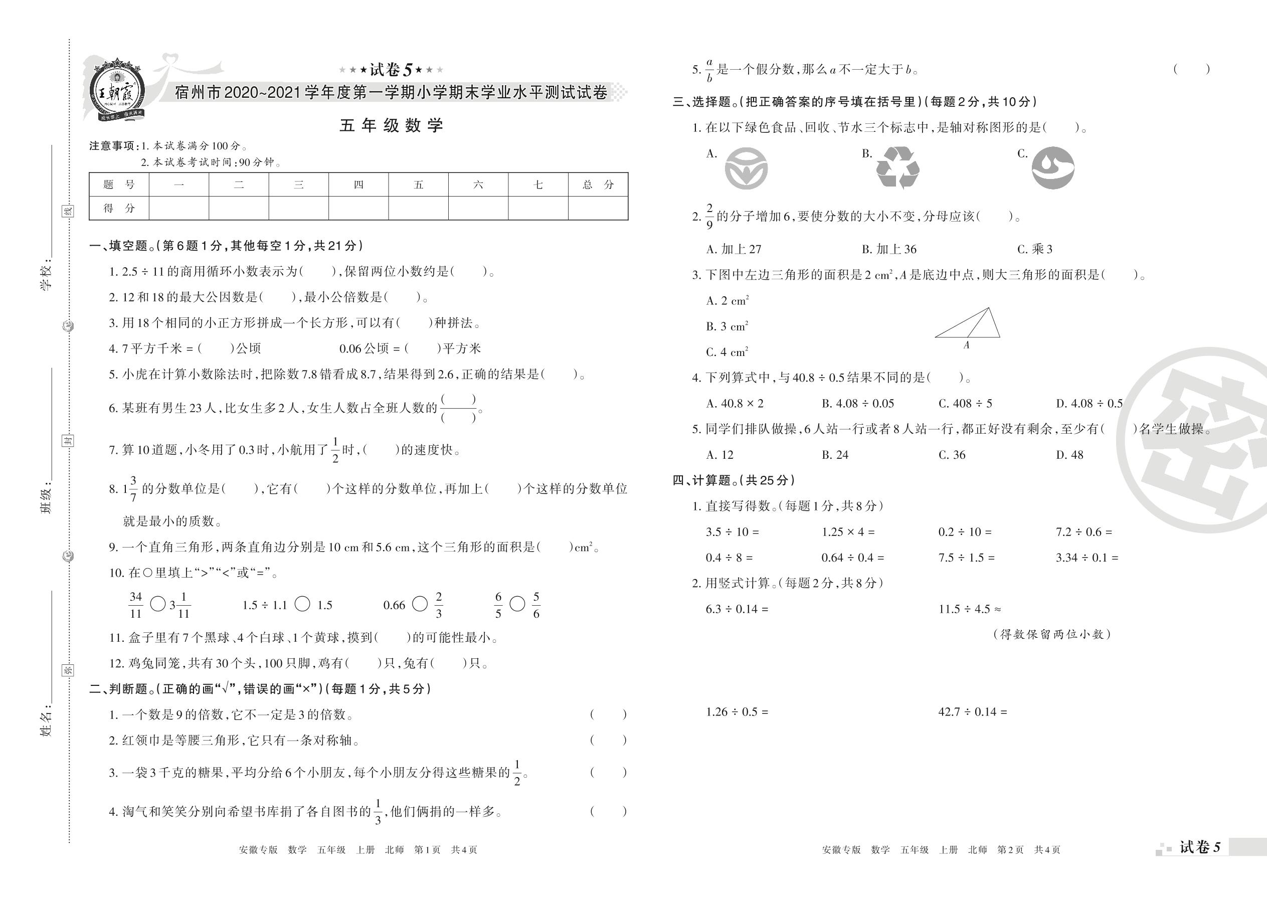 宿州市2020~2021学年度第一学期小学期末学业水平测试试卷五年级数学(北师版)【5】