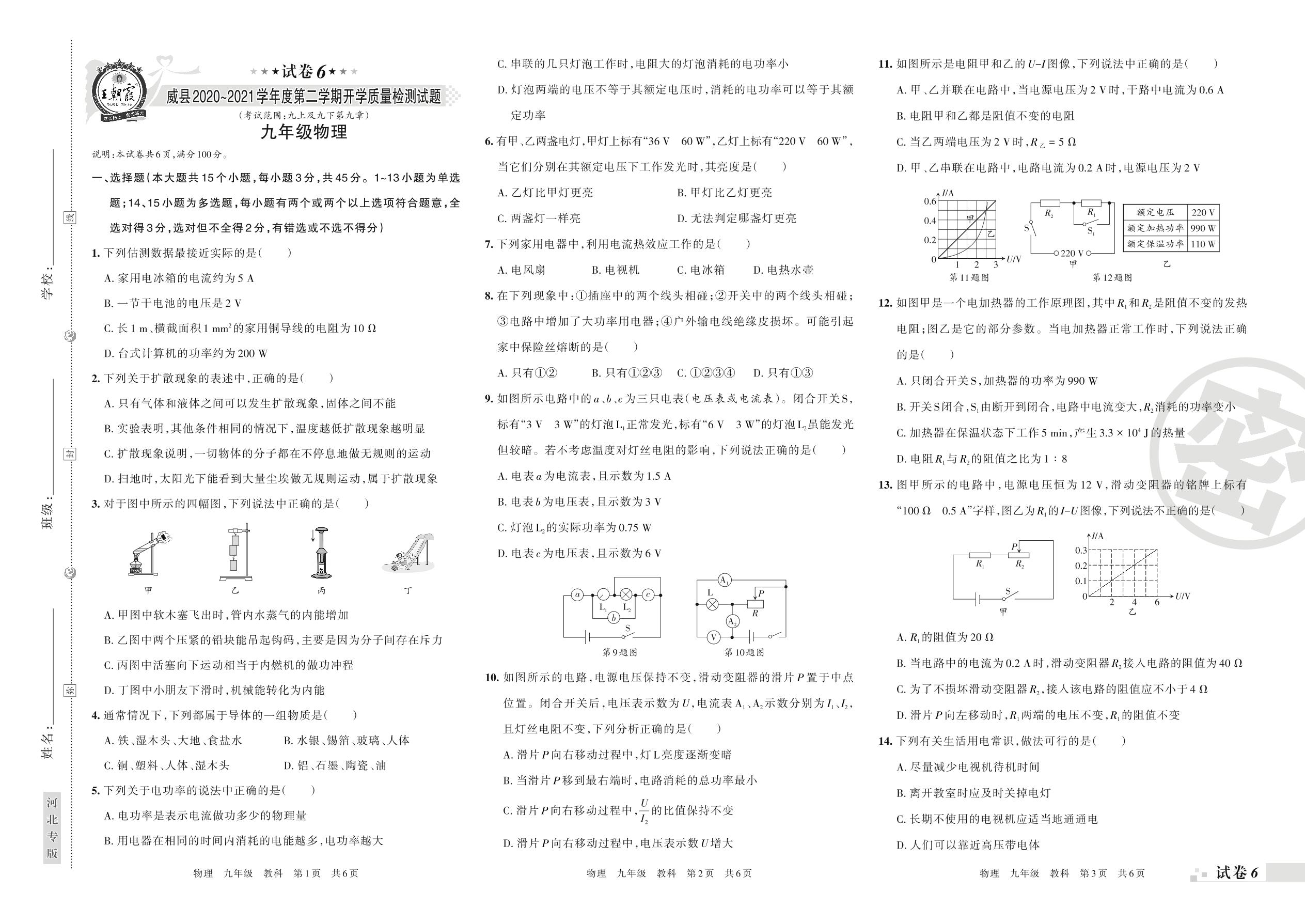 威县2020~2021学年度第二学期开学质量检测试题九年级物理(教科版)【6】