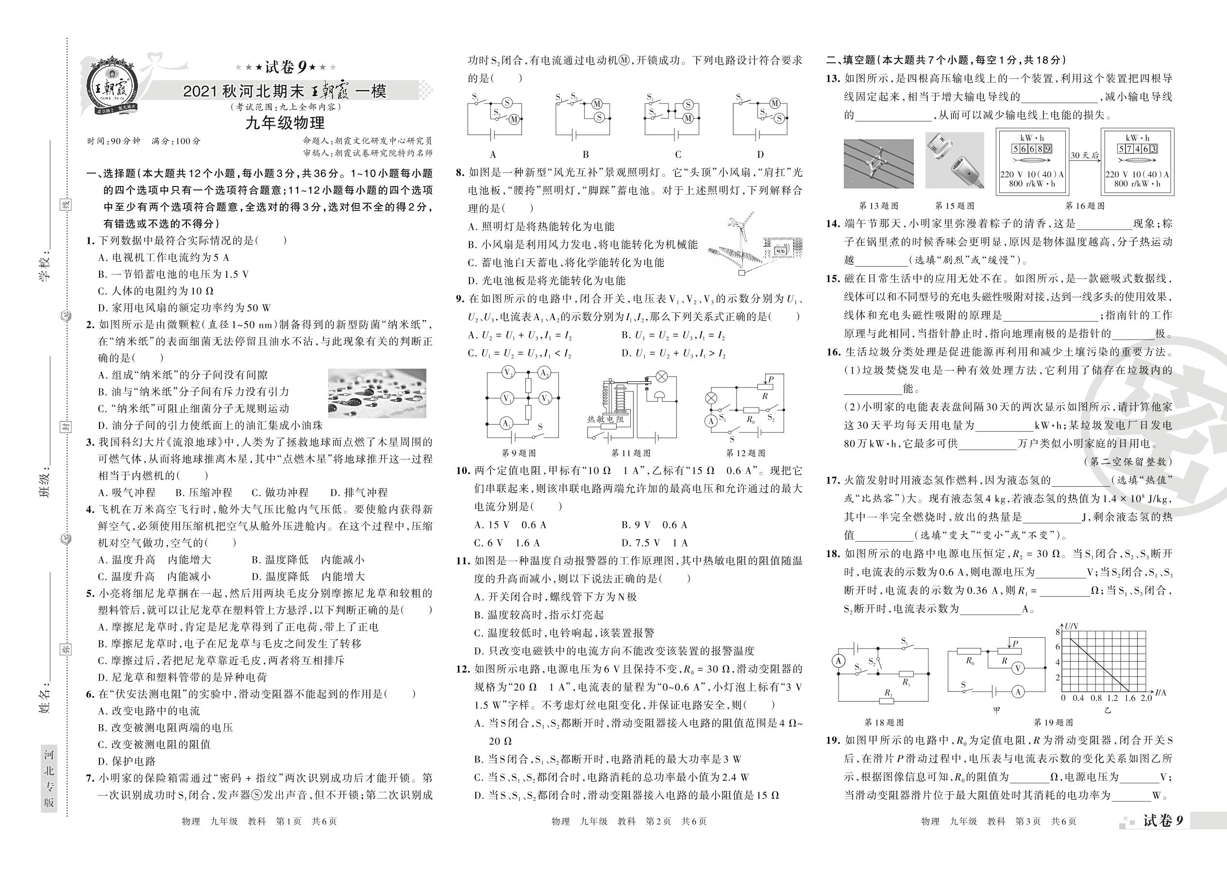 2021秋上册河北期末王朝霞一模九年级物理(教科版)【9】