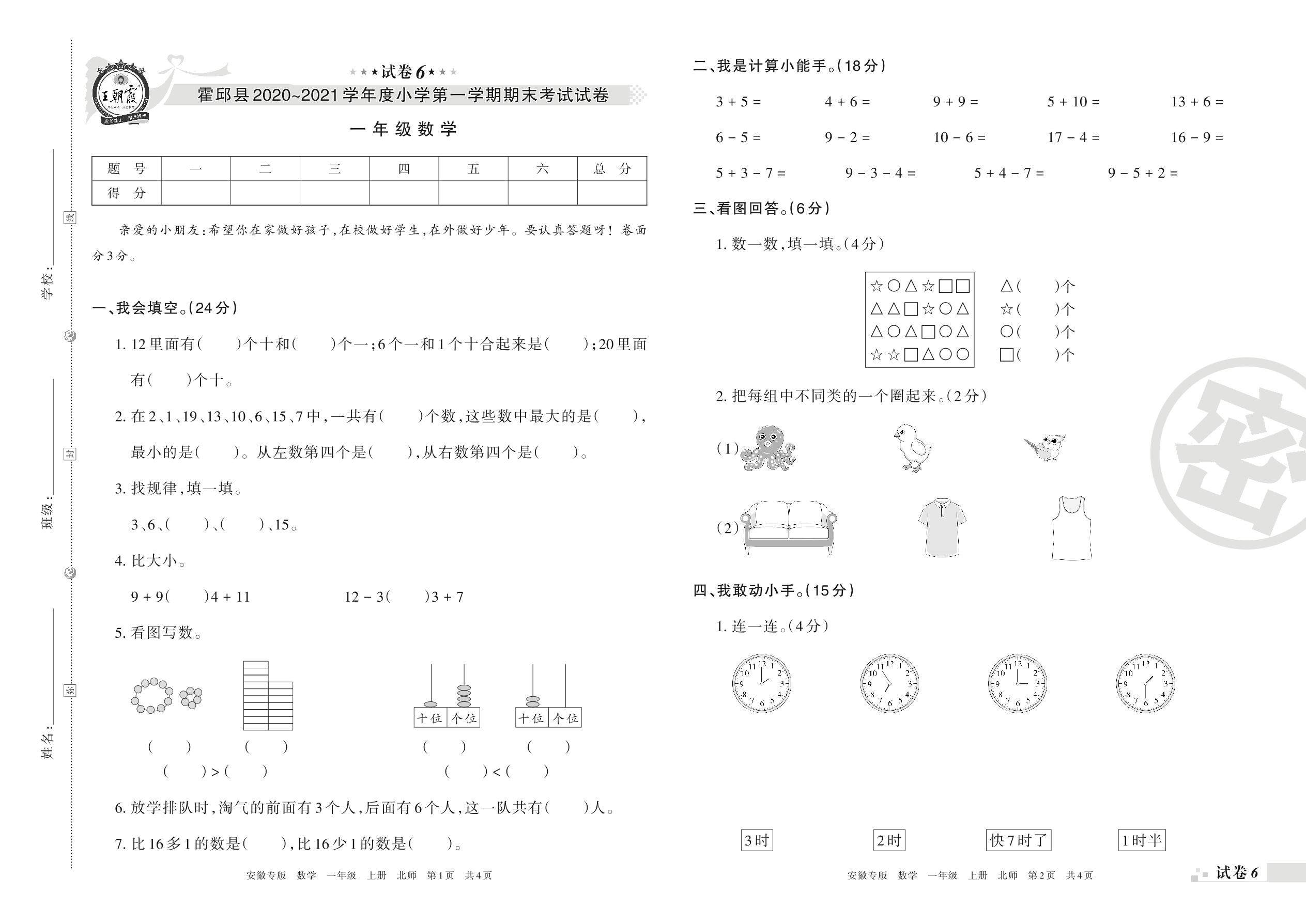 霍邱县2020~2021学年度小学第一学期期末考试试卷一年级数学(北师版)【6】