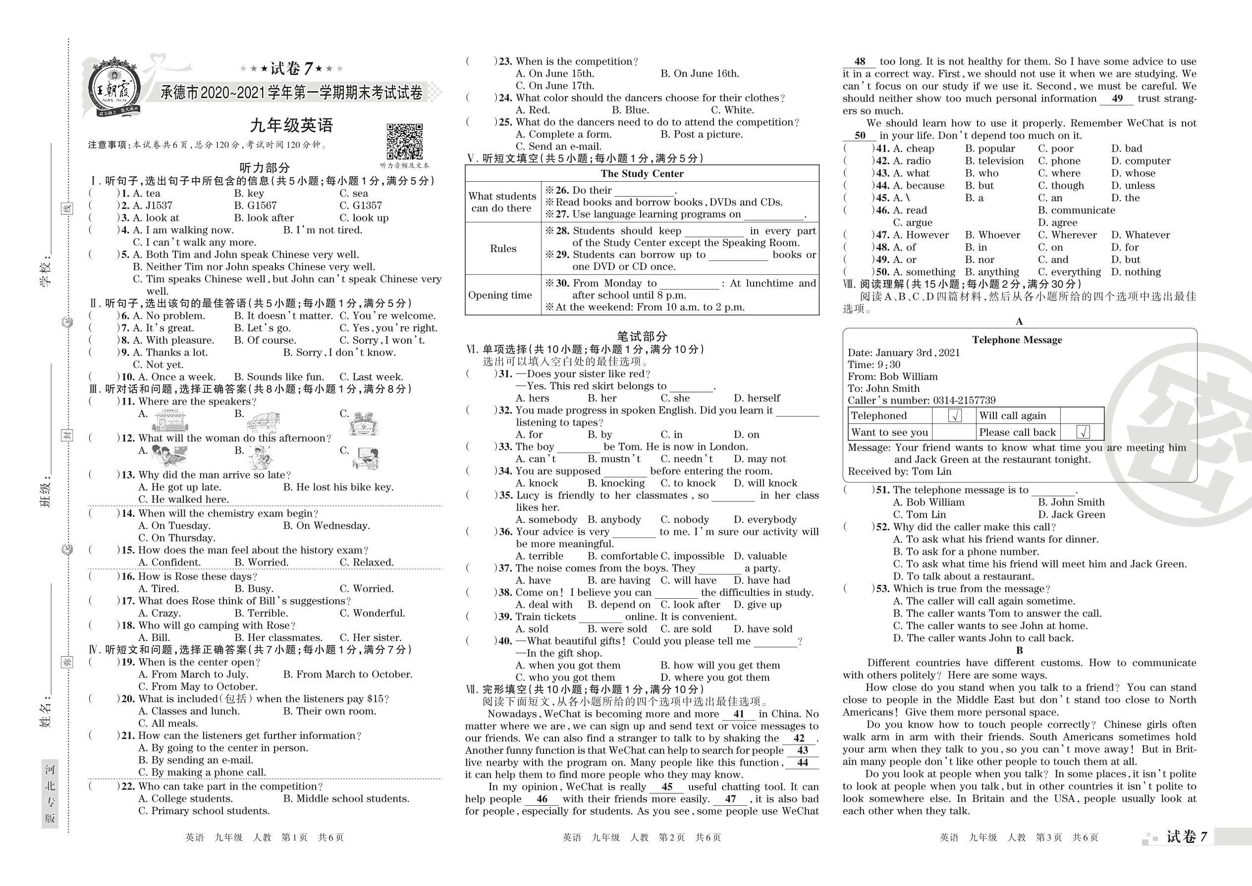 承德市2020~2021学年第一学期期末考试九年级英语(人教版)【7】