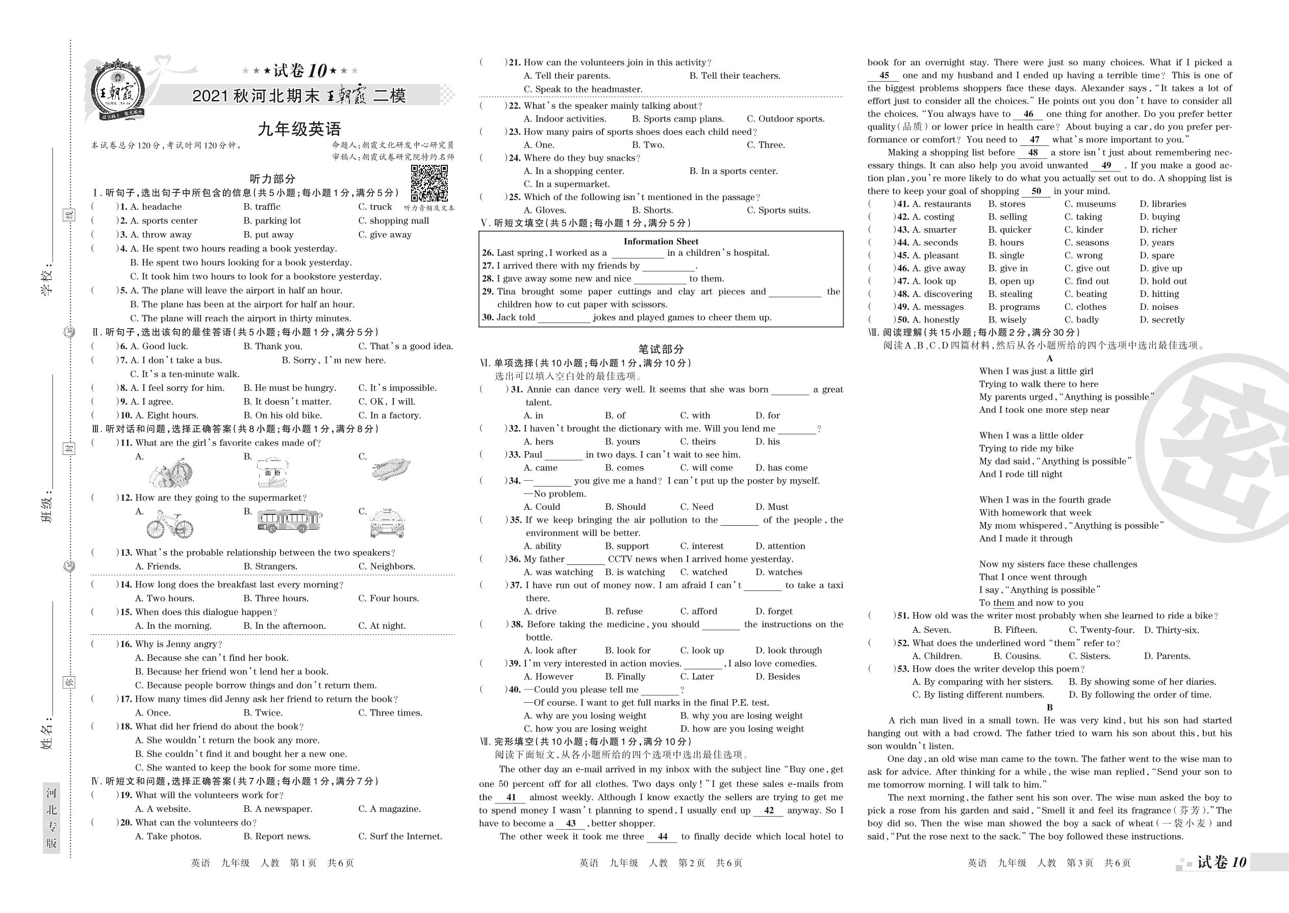 2021-2022学年第一学期王朝霞期末模拟卷九年级英语(人教版)【10】