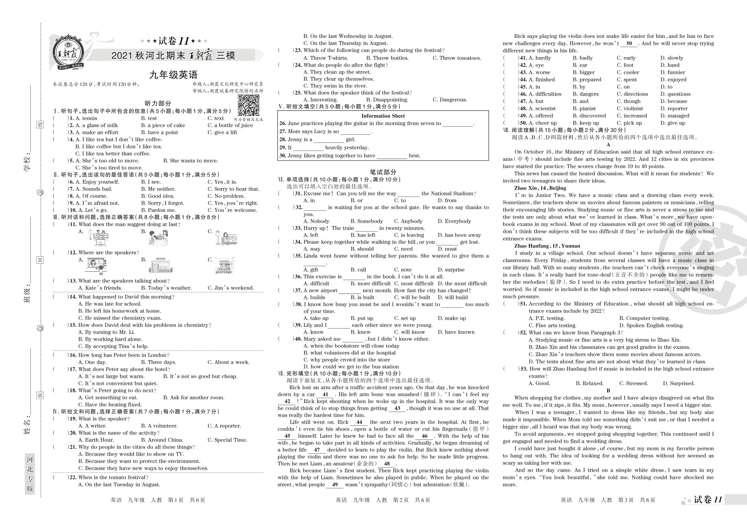 2021-2022学年第一学期王朝霞期末模拟卷九年级英语(人教版)【11】