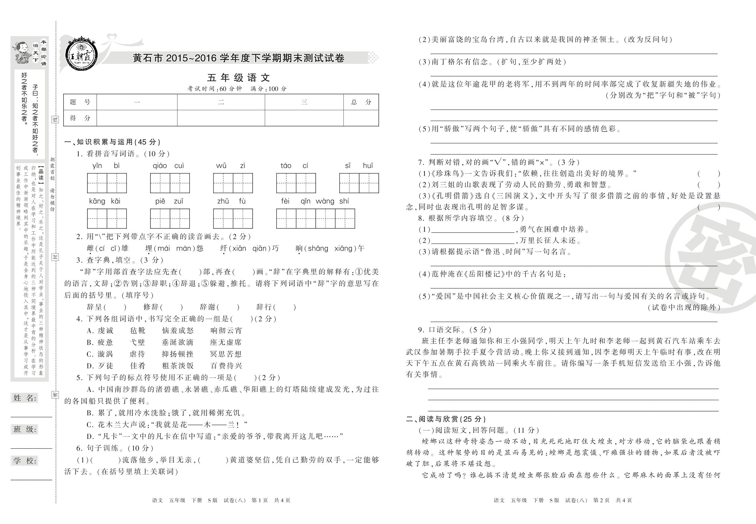 2015-2016学年第二学期黄石市五年级语文试卷(S版)_R210801212533【8】