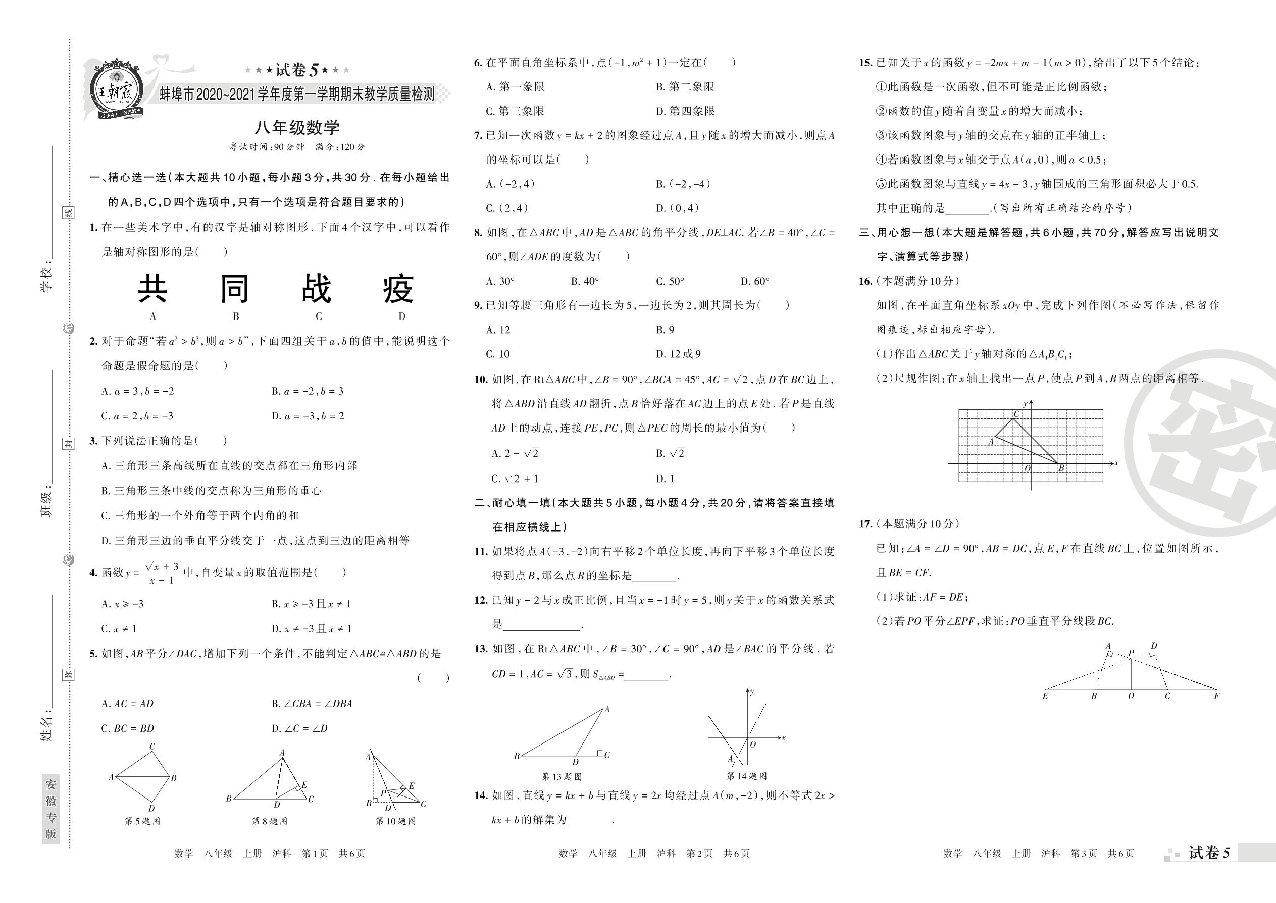 蚌埠市2020~2021学年度第一学期期末教学质量检测八年级数学(沪科版)【5】