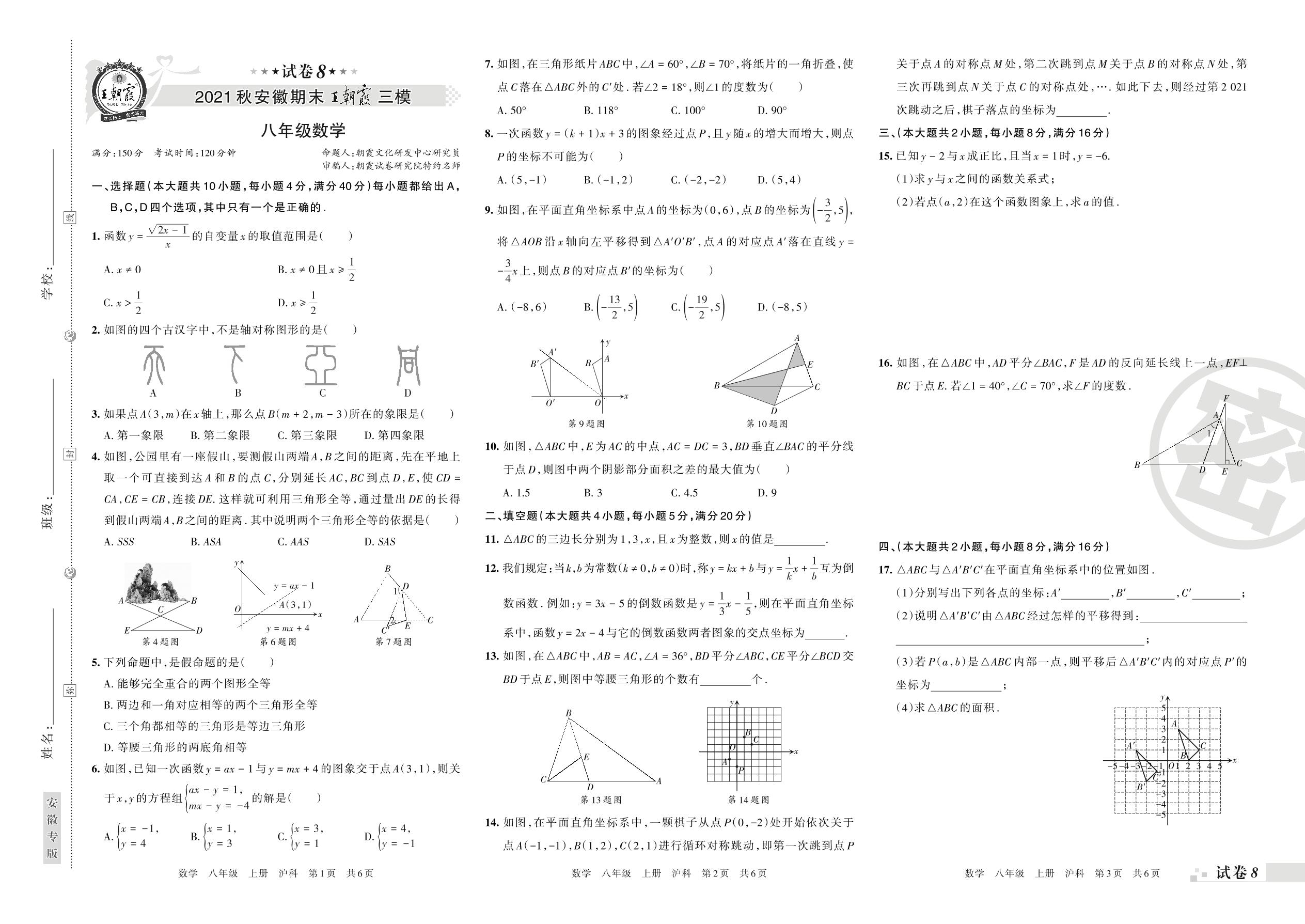 王朝霞期末模拟卷八年级上册数学(沪科版)_R211222143258735【8】