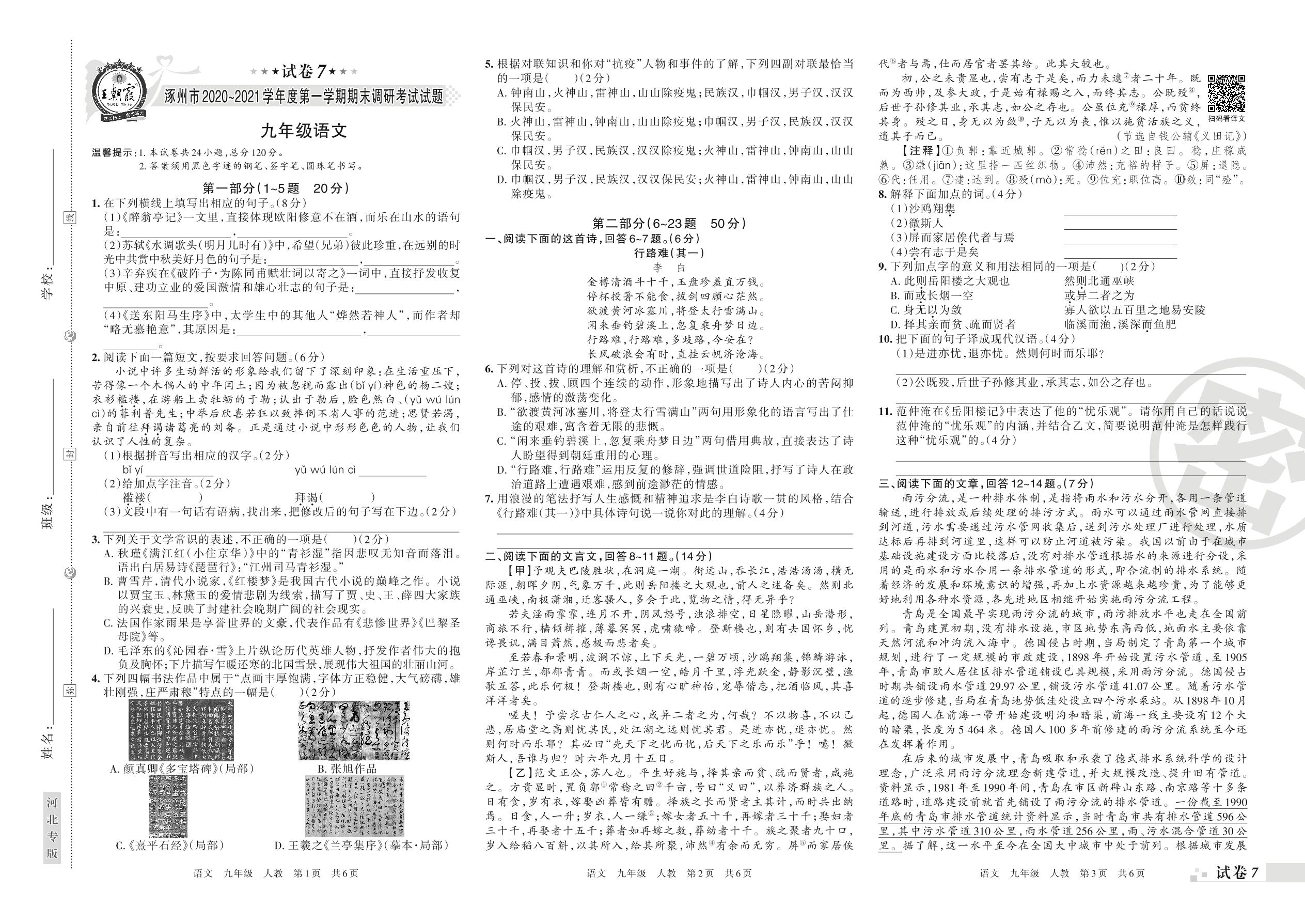 涿州市2020~2021学年度第一学期期末调研考试试题九年级语文(人教版)【7】