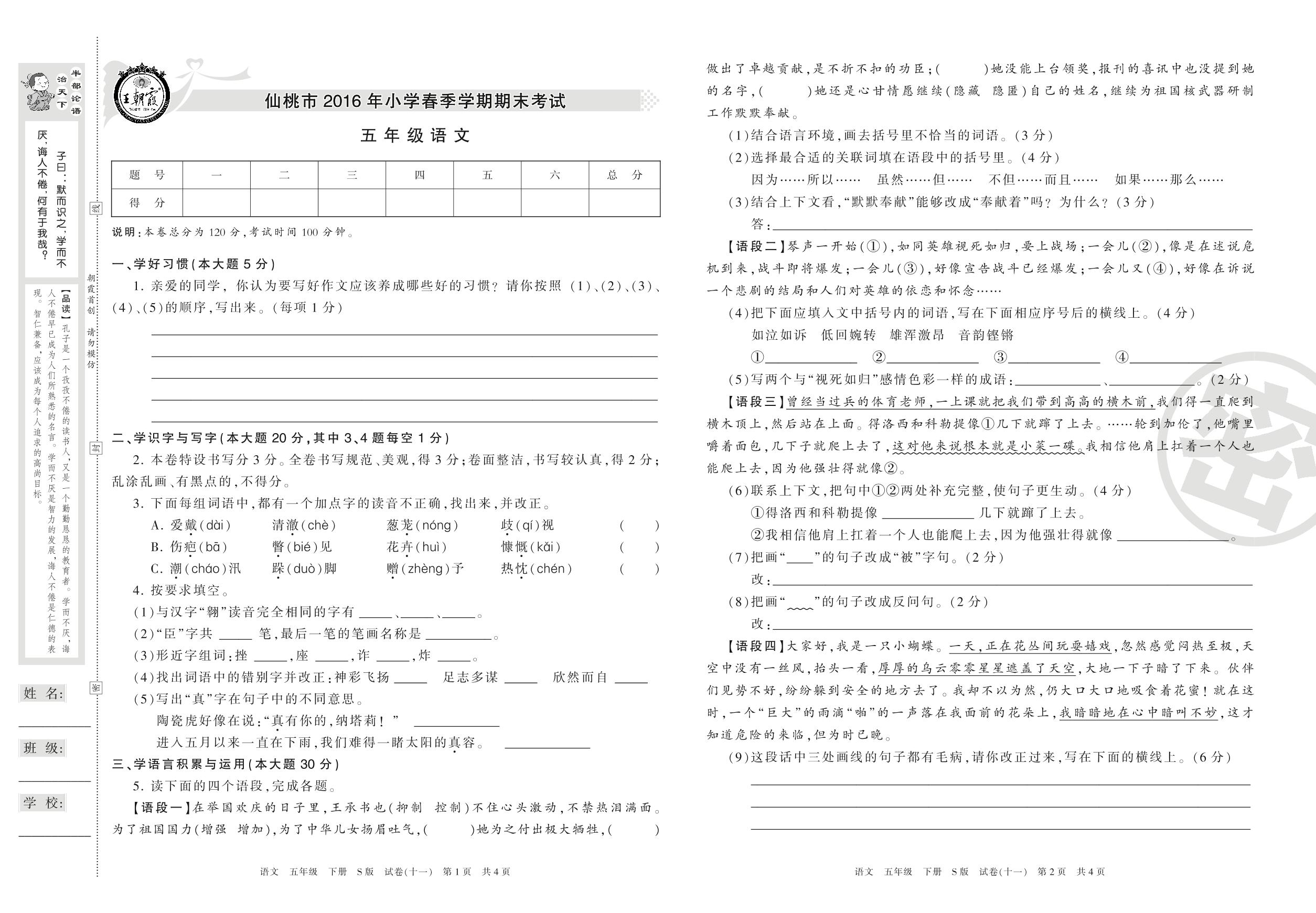 2015-2016学年第二学期仙桃市五年级语文试卷(S版)【11】