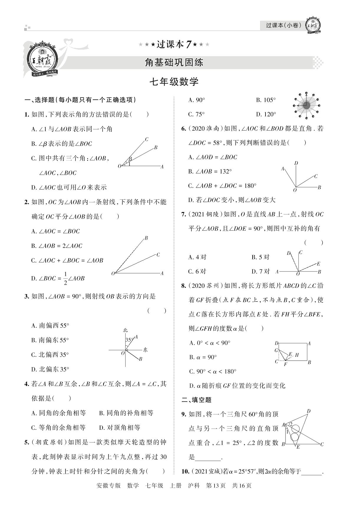 王朝霞期末过课本——角基础巩固练七年级上册数学(沪科版)【7】