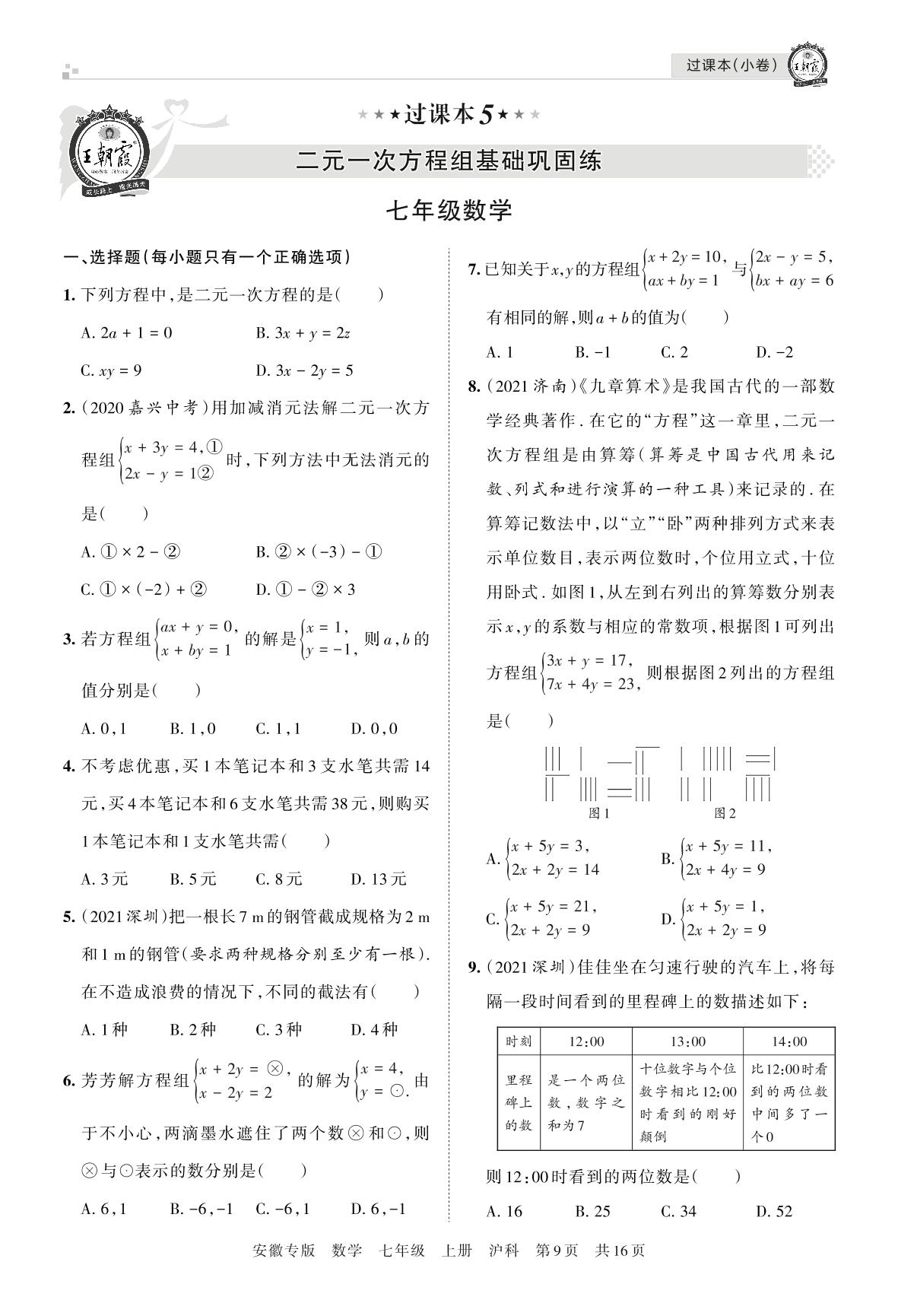 王朝霞期末过课本——二元一次方程组基础巩固练七年级上册数学(沪科版)【5】