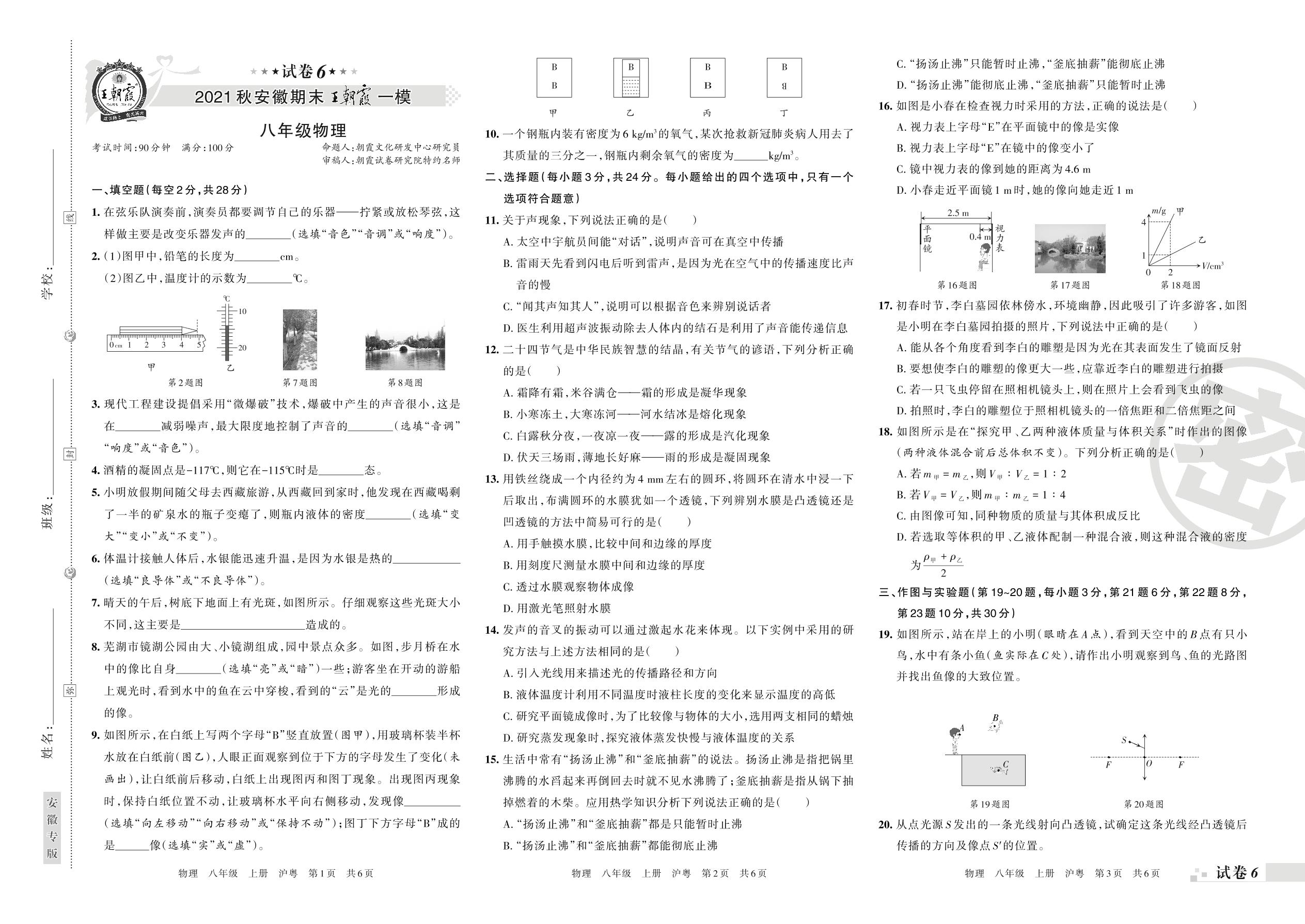 王朝霞期末模拟卷八年级上册物理(沪粤版)【6】
